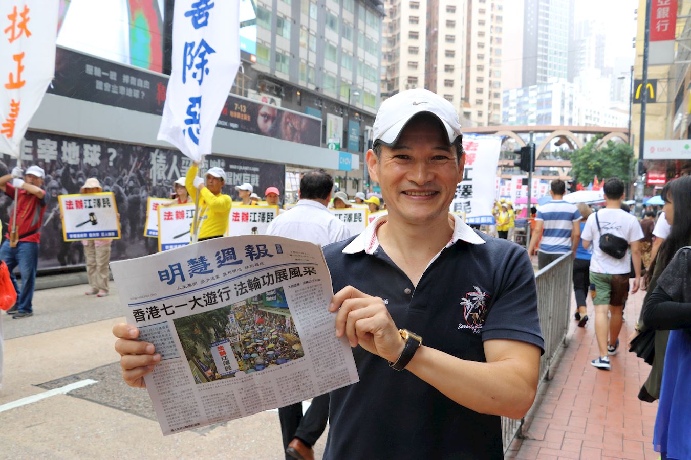 来自福建的周先生也是第一次来香港就看到法轮功的游行,感觉很震撼,他手里也拿着一份《明慧周报》,直言香港很自由。