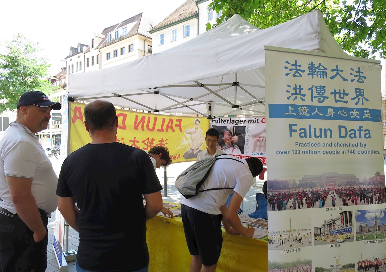 人们被法轮功学员祥和的功法展示吸引,他们驻足观看,当了解到中共十八年来一直在迫害修炼“真、善、忍”的法轮功学员,都感到不可思议。人们震惊于中共的残酷迫害,有人一看到这个信息,二话没说就走到信息台前签名,谴责中共迫害法轮功,制止中共活体摘取法轮功学员器官的罪恶。有些人在跟法轮功学员交谈之后,了解到了什么是法轮功,为什么中共要迫害法轮功,也纷纷签名声援法轮功学员。一位中年德国女士说:“看来真善忍是解决一切社会问题的根本。”有些当地民众打听慕尼黑炼功点的信息,有的表示马上想学炼法轮功。