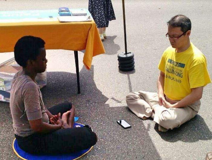 其中有一位名叫Potia的非裔女孩,身体不同部位常会无原因的感到痛苦和紧张。学炼了法轮大法的第三套功法后,Potia感觉轻松许多。她又要求学员教她第五套功法。学会了基本动作后,就与学员一起打坐了三十分钟。炼完后,她的脸上充满了平静与祥和,再三向学员表示感谢,并表示会去当地炼功点进一步学习。