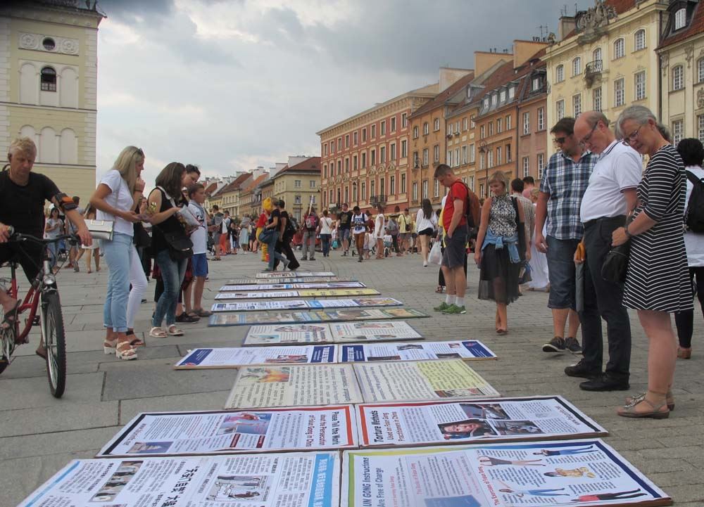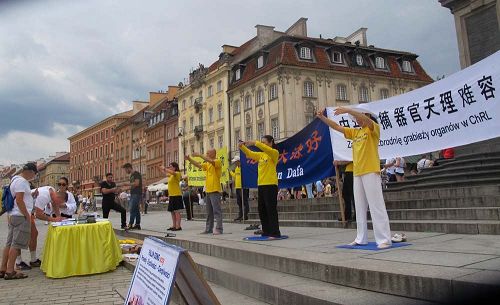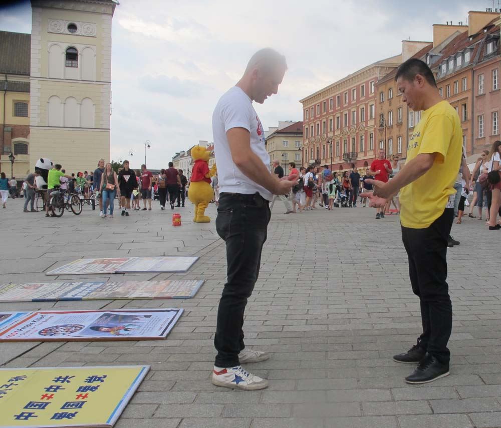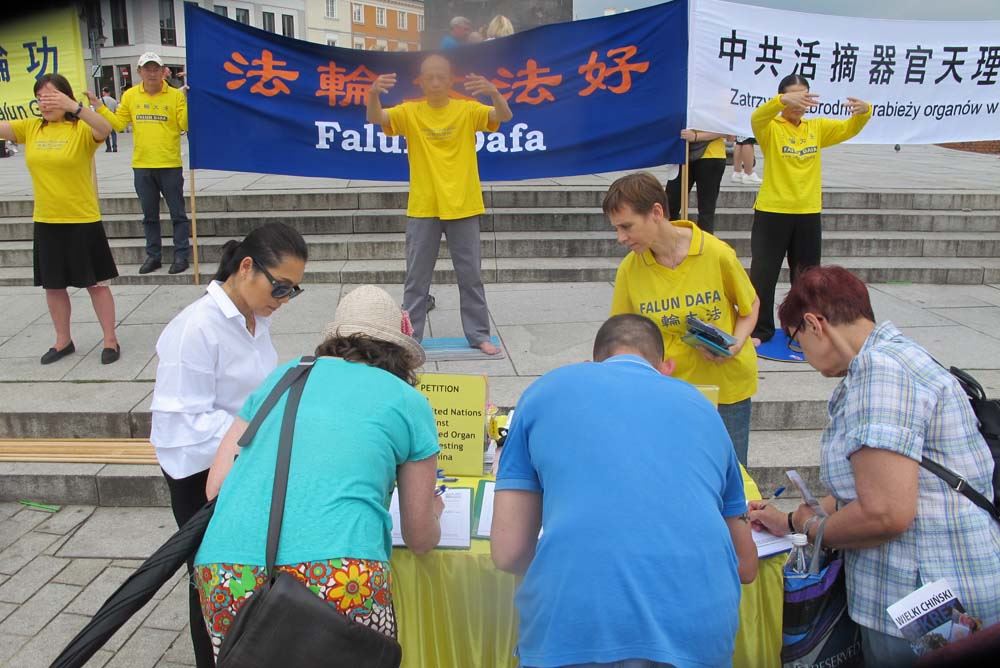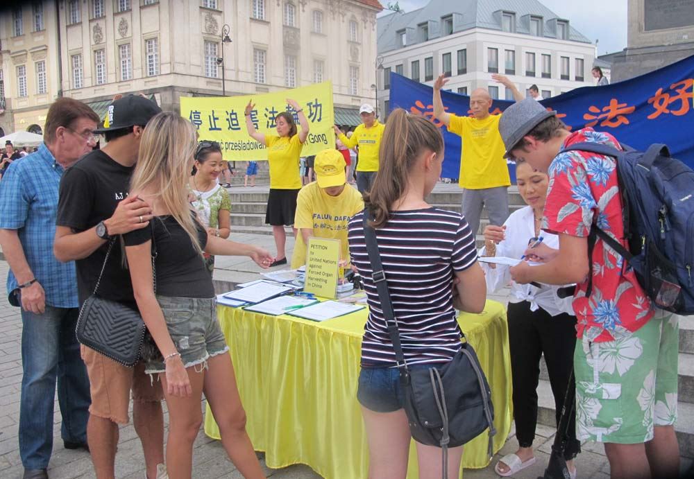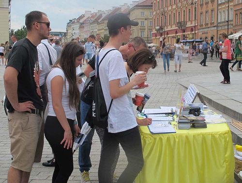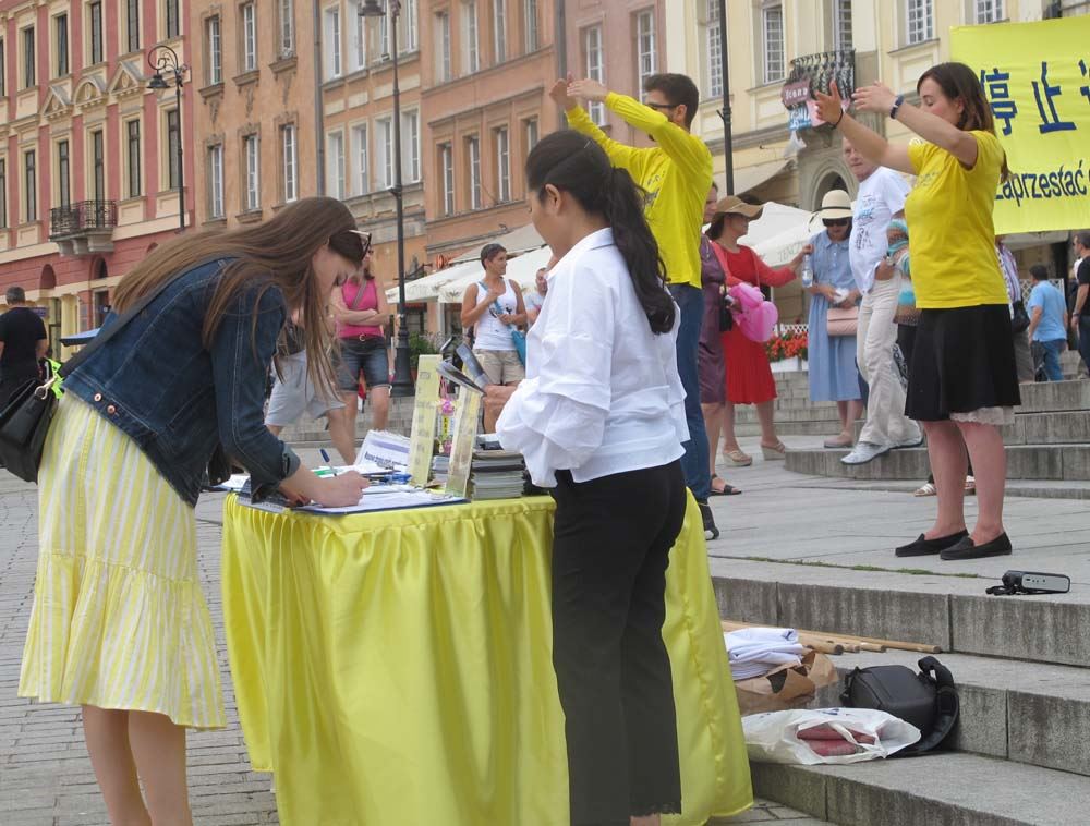 当天下午,法轮功学员又来到华沙古城中心广场,为过往行人讲解法轮功真相及展示法轮功功法并呼吁波兰人民和各界人士都来关注这场历史上最邪恶的迫害,法办元凶江泽民,解体中共,结束迫害。很多人拍照展板内容,录像法轮功动作,也有很多人排队在反对迫害法轮功的征签簿上签名。