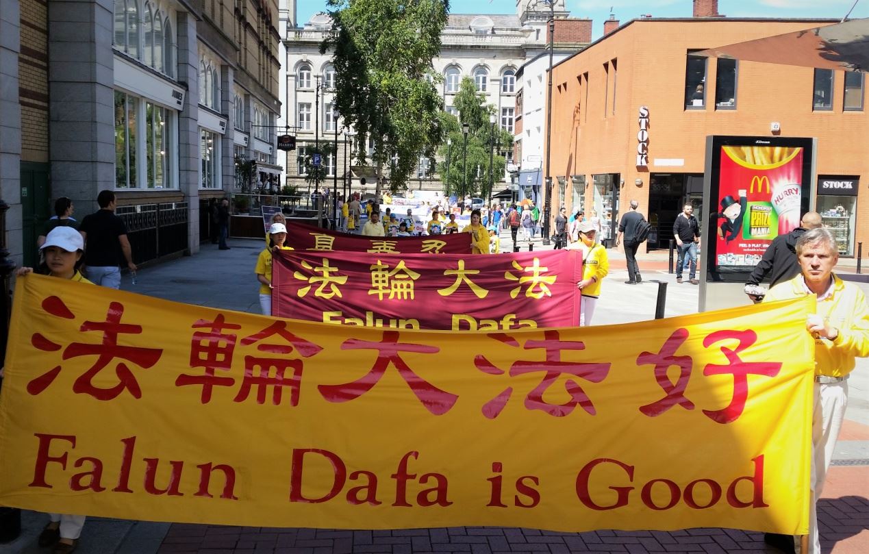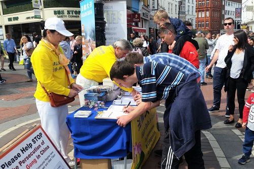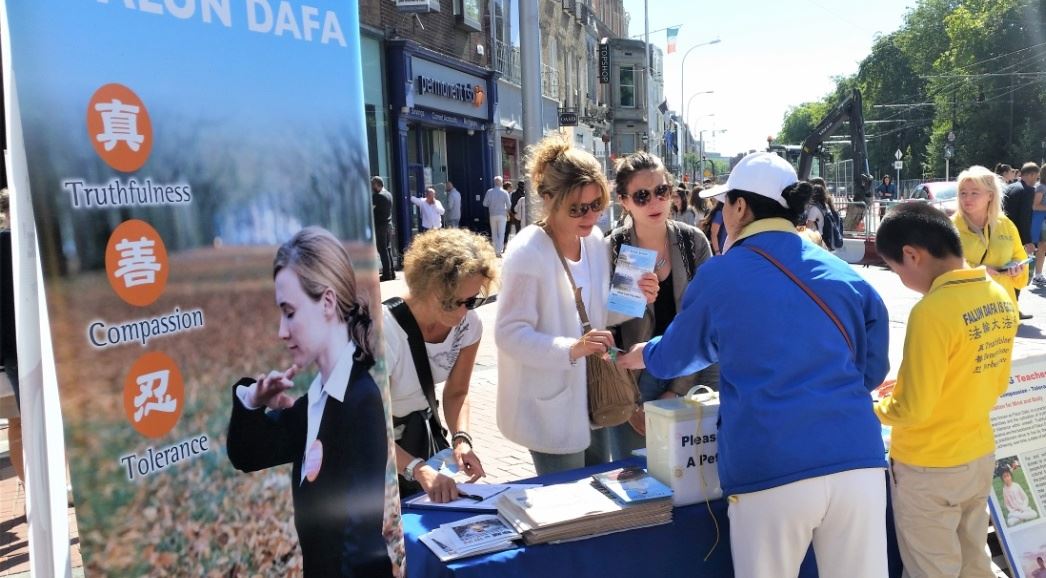 两名游客模样的华人经过法轮功集会摊位时停了下来,当法轮功学员建议他们进行三:退.时,年龄较大的男子连连说:“早退了,早退了。”这名华人表示前一天在英国伦敦旅游时,当地法轮功学员就已经帮助其办理了三:退.。他收下了法轮功小学员送给他的印有“法轮大法好”的纸莲花。