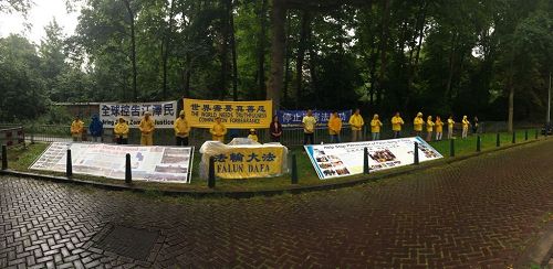 二十日上午,学员们来到中共驻海牙领馆所在地进行和平抗议。在这些年的反迫害中,学员们通常采用炼功或派发资料的方式告诉人们法轮功真相,他们没有仇恨和报复,非常和平理性,就是在中领馆所在地也不例外。