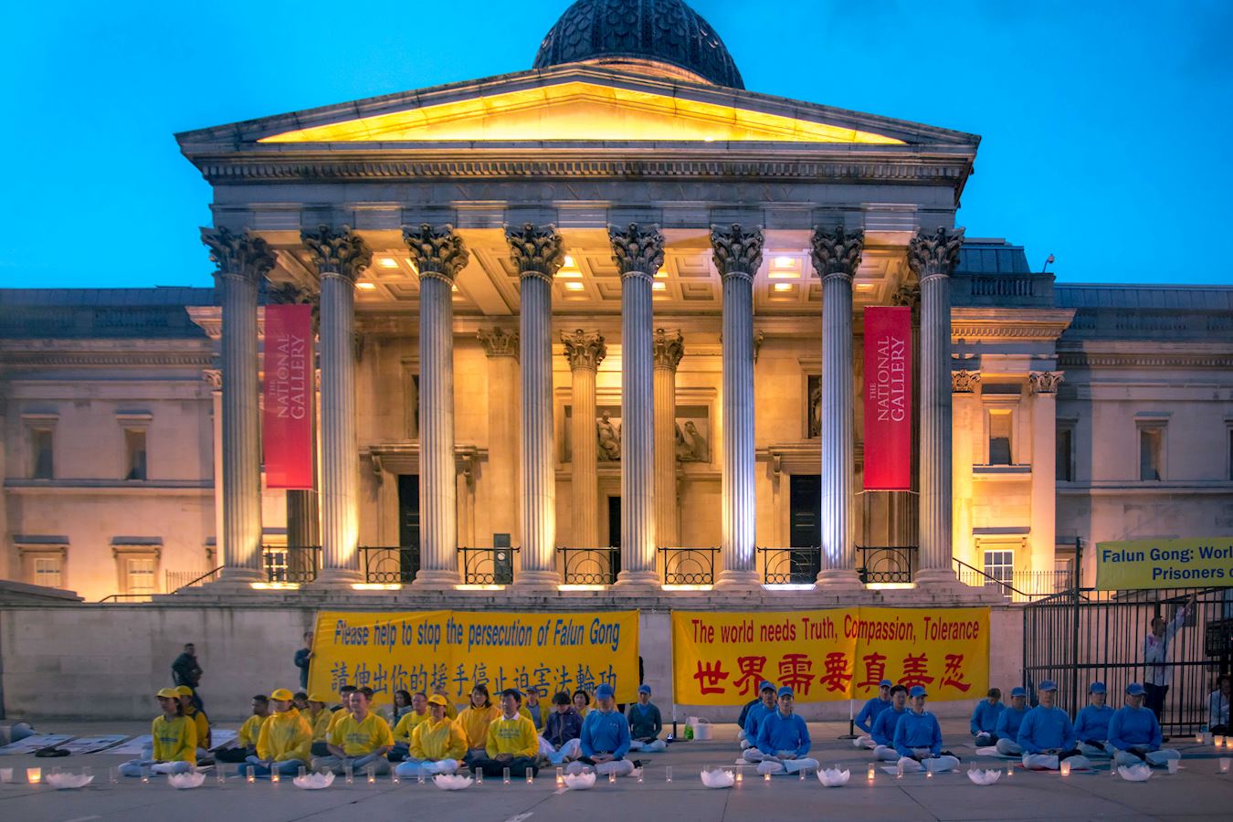 【明慧网二零一七年七月二十六日】(明慧记者唐秀明英国采访报道)二零一七年七月二十三日,英国法轮功学员白天举办集会游行后,傍晚又接着在伦敦特拉法加广场北台阶举行烛光守夜活动,悼念十八年来被中共虐杀的法轮功学员,呼吁国际社会各界民众共同制止中共迫害法轮功,呼唤更多世人了解真相、拥抱明天的希望。