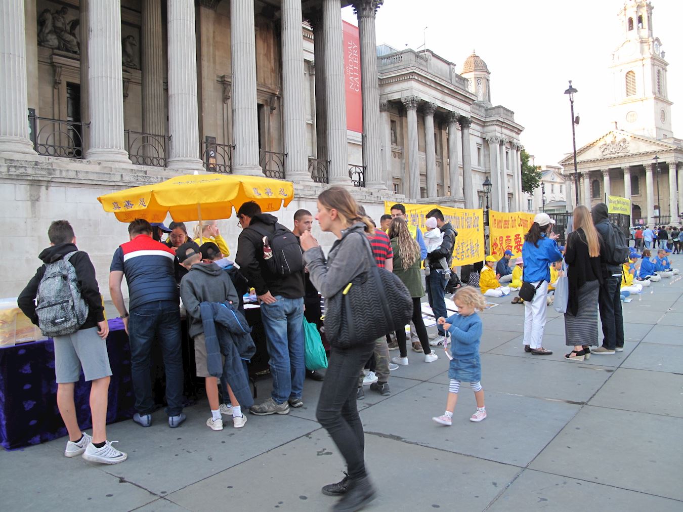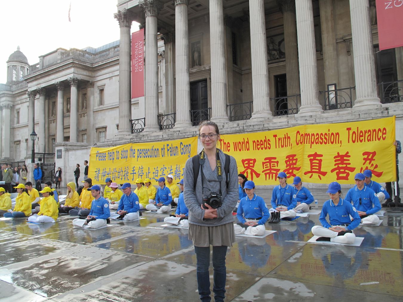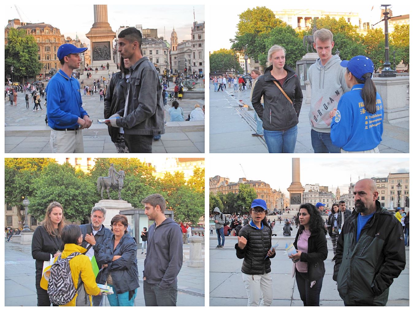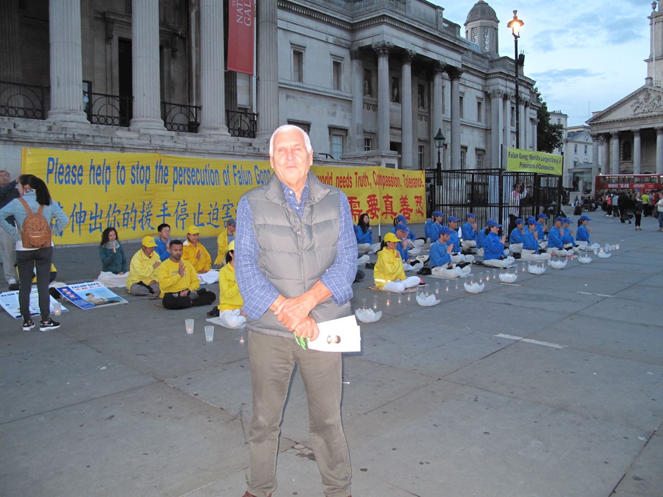 一位叫弗莱德的英国老先生住在鸽子广场周边一座高楼里,在家里观察了法轮功学员几个小时的活动,傍晚带着好奇和敬意来到法轮功学员的活动场地,并与多位法轮功学员长时间交谈。他认为法轮功学员在做着非常有价值的事,法轮功学员反迫害是正义和邪恶的较量,他相信法轮功学员一定会成功。