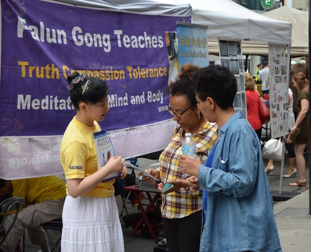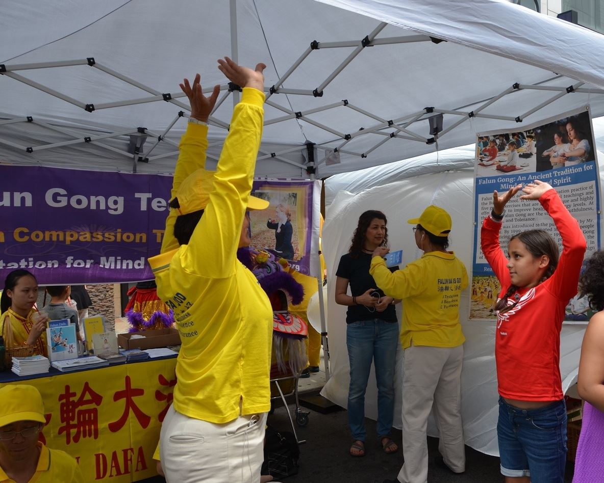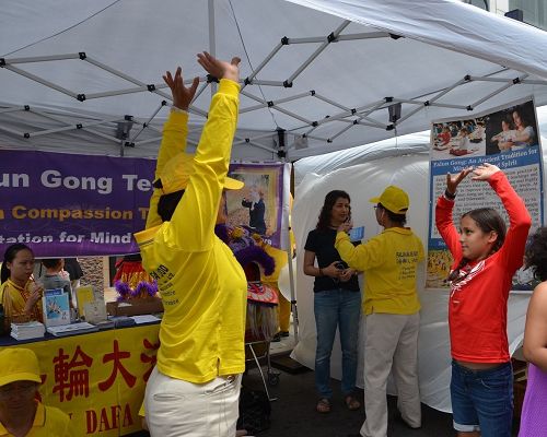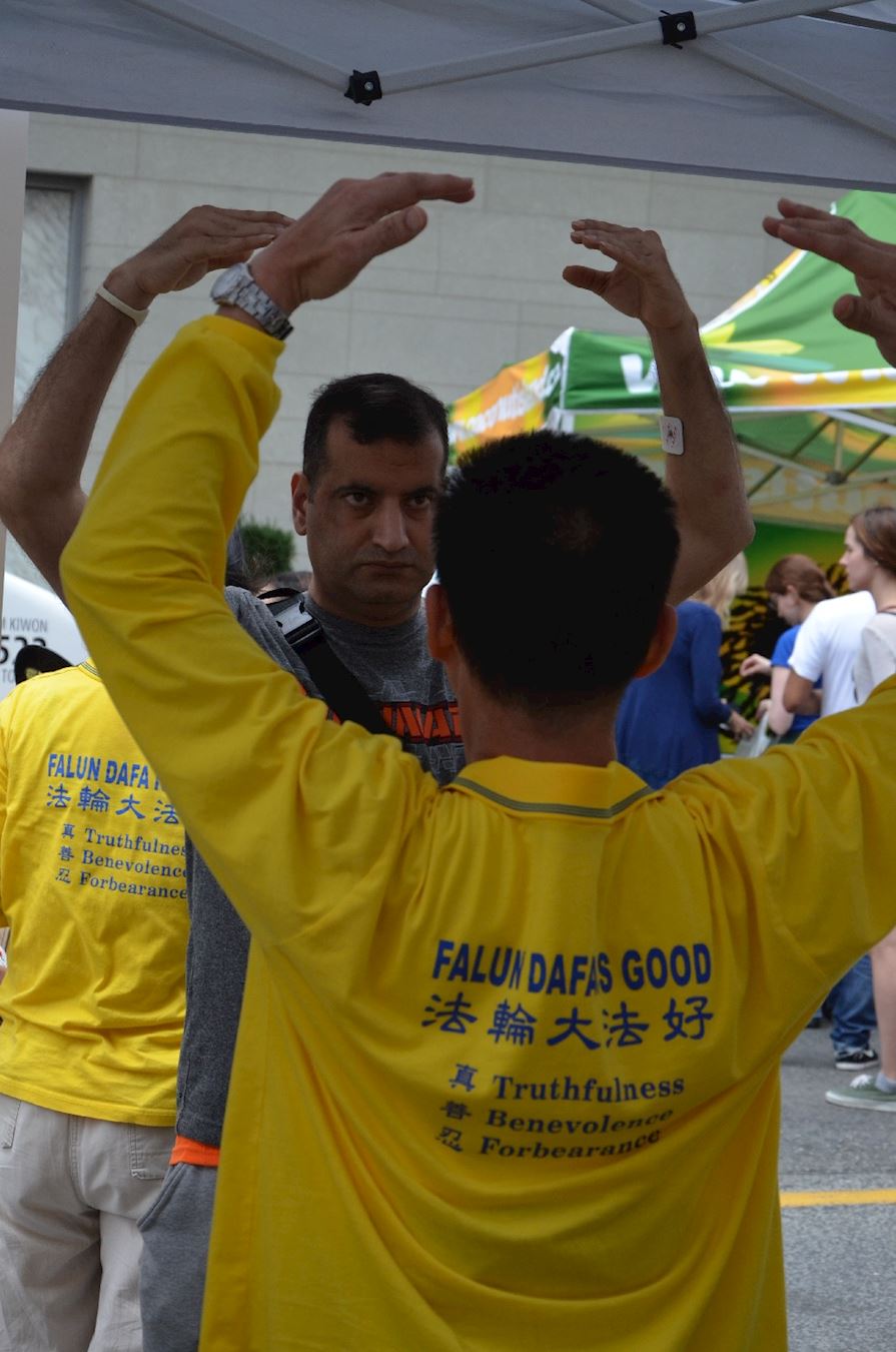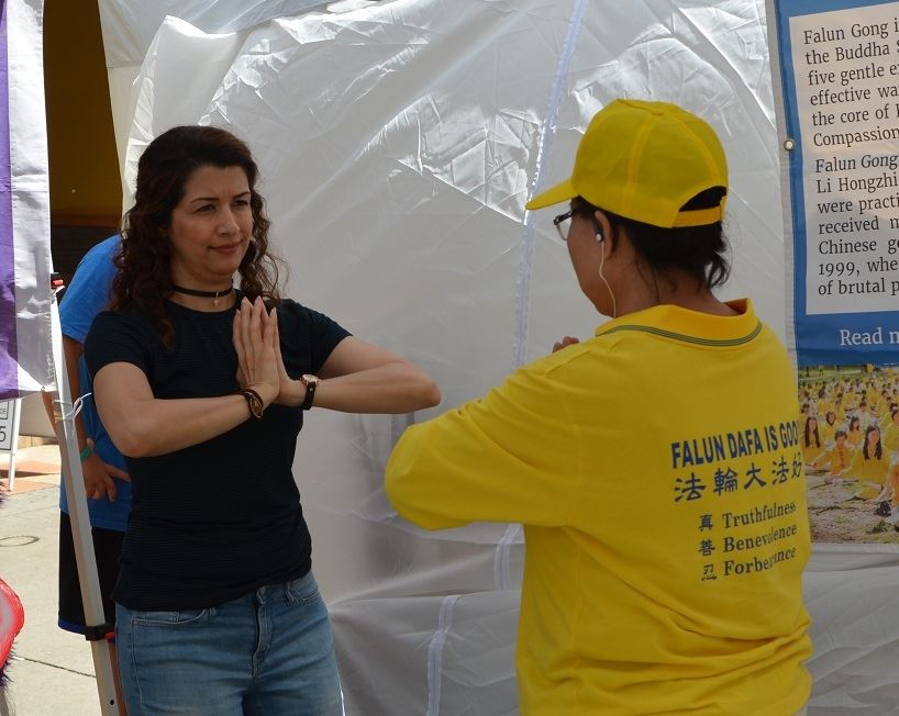 伊朗裔的梅根(Megan)女士在阅读了介绍法轮功的传单后表示她想学功,在跟着学员做了第一套功法的几个动作后,她告诉学员:“天哪!这么强的能量!”梅根临走时惊喜地了解到不仅法轮大法网站有波斯语,连教功录像也有自己的母语的翻译,她说回家后要马上开始炼法轮功了。