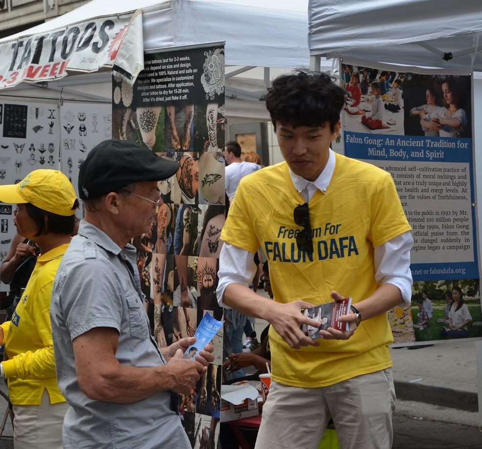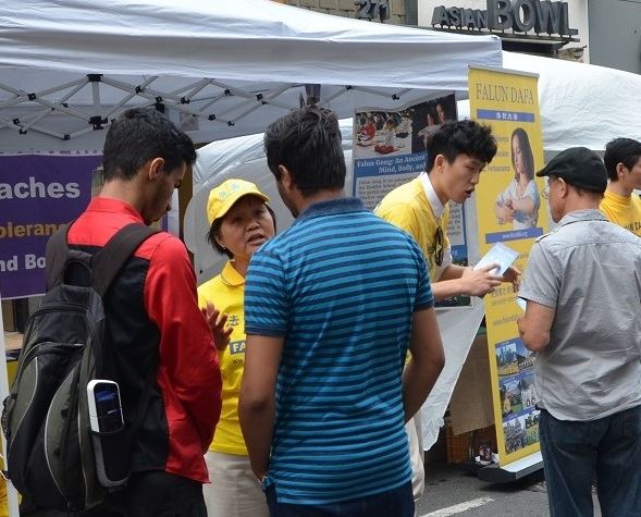 早晨,展位刚刚摆,周先生就走上前和学员交谈起来。他告诉学员,他知道法轮功祛病健身的神奇功效,自己在大陆一所高校任职的亲人就炼法轮功,“炼法轮功的人层次都很高,一定有他的道理的。”周先生还告诉学员,他去唐人街总能看到学员在那里讲真相:“在哪里都能看到你们!”