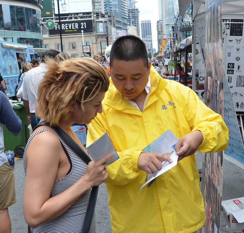 ![]() 图3~4:加拿大国家青年日活动,多伦多法轮功学员给游客讲真相 |