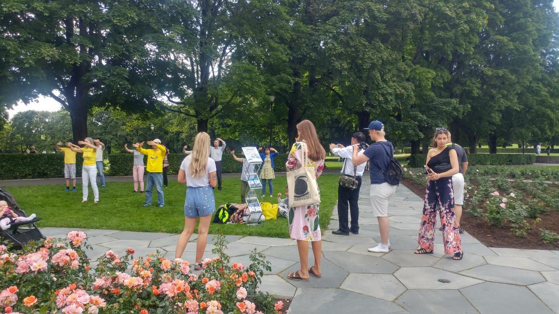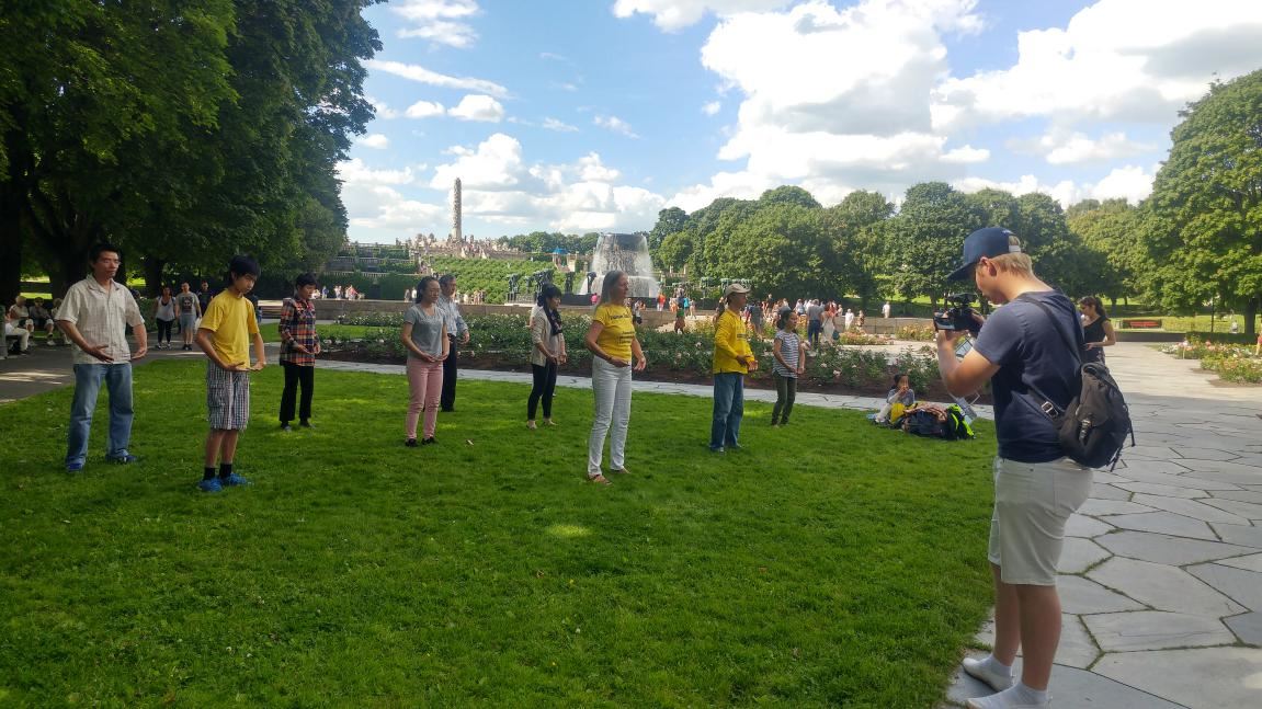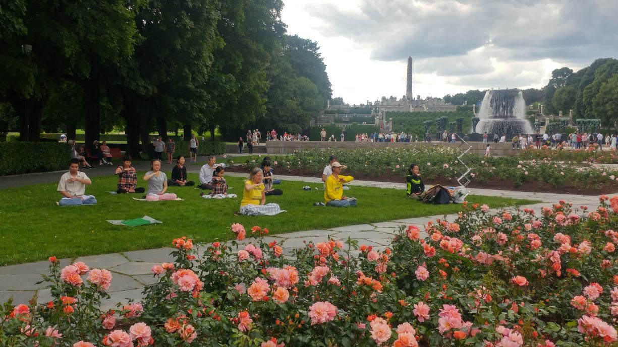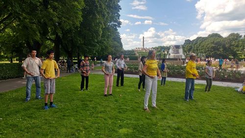 二零一七年七月的奥斯陆风和日丽,气候宜人。每年春夏季,来奥斯陆观光旅游的游客络绎不绝。维格兰雕塑公园是游客们必不可少的参观景点之一。挪威法轮功学员每周日下午自发来这里弘法炼功。他们安静、祥和的炼功场面成为雕塑公园一个景观。