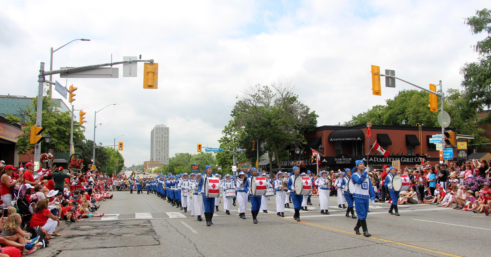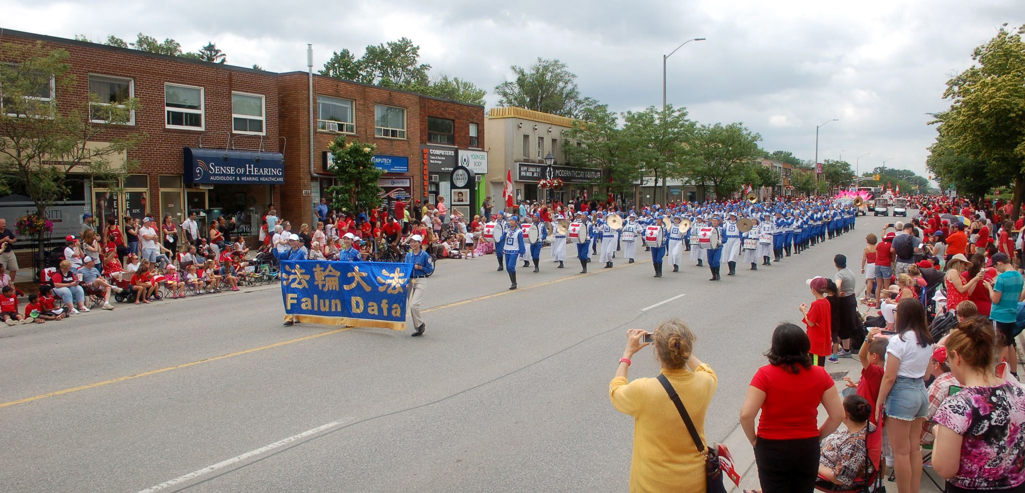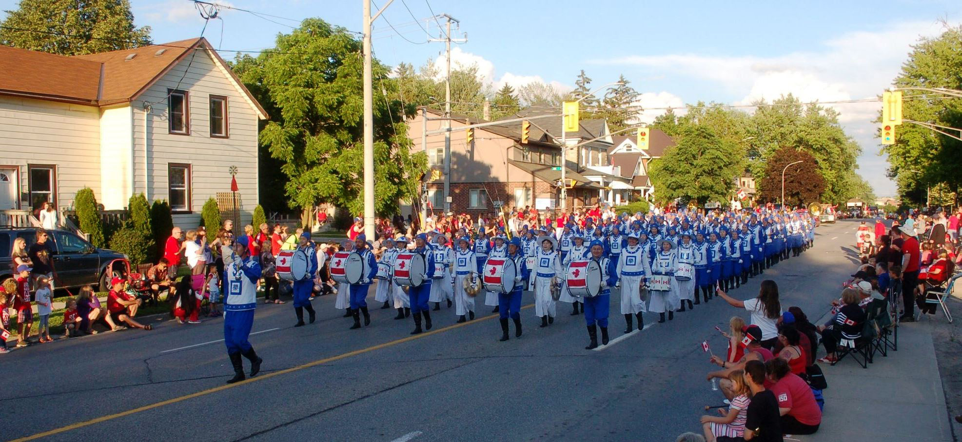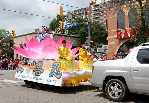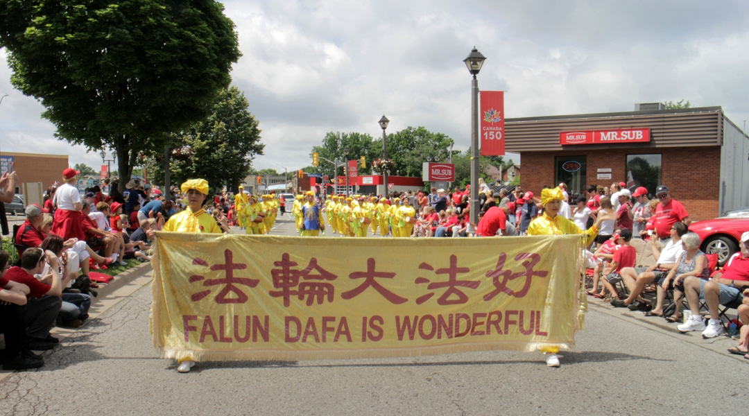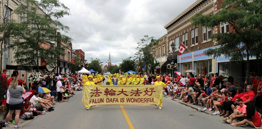 天国乐团上午11点参加了密西沙加(Mississauga)的国庆日大游行(Port Credit Canada Day parade),下午赶到距离多伦多150公里的斯特拉特福(Stratford)参加当地7点的游行(Stratford Canada Day Parade);腰鼓队一早赶到尼加拉瓜瀑布(Niagara Falls)参加11点的游行,下午回到多伦多参加4点的士嘉堡市(Scarborough)的国庆大游行。所到之处,法轮功学员的风范,大受观众的称赞,天国乐团雄壮的鼓号声与优美的乐曲旋律,震撼感动了观众们的心。