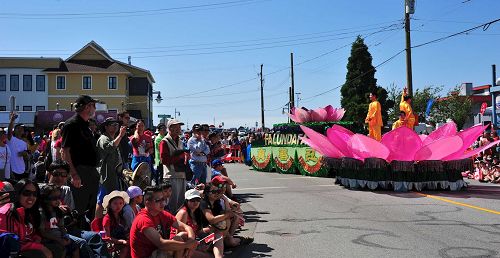 法轮功学员的游行队伍由天国乐团,花车,法轮功功法演示队和腰鼓队组成。所到之处受到道路两旁观众们的热情欢呼,很多观众随着天国乐团的音乐一起应和,很多观众一边拍摄法轮功学员的游行队伍一边竖起大拇指或一边挥手表示欢迎,不时可以听到“Wonderful!”“ No.1 ”等赞美之声,还有一些观众在路边模仿法轮功学员的炼功动作。很多华人也纷纷赞叹“法轮大法来了”、“真善忍”、“法轮功人真多呀”。