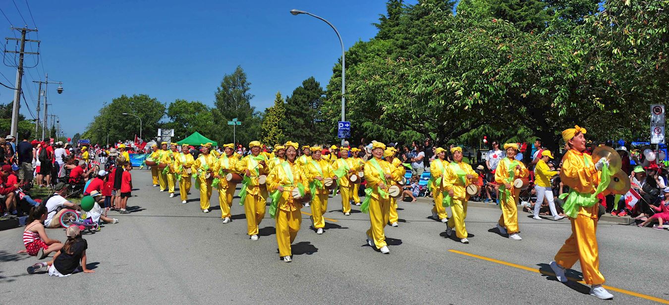 Bob Carwen先生感叹:“时光飞逝,五十年前,我和太太在蒙特利尔庆祝加拿大一百周年,一转眼五十年过去了,我们在温哥华庆祝加拿大一百五十周年。今天很高兴看到了不同族裔的队伍带来不同的文化,法轮大法带来了中国文化,他们都是我们社区的成员,感谢他们的努力演奏给我们带来欢乐,这非常好。”