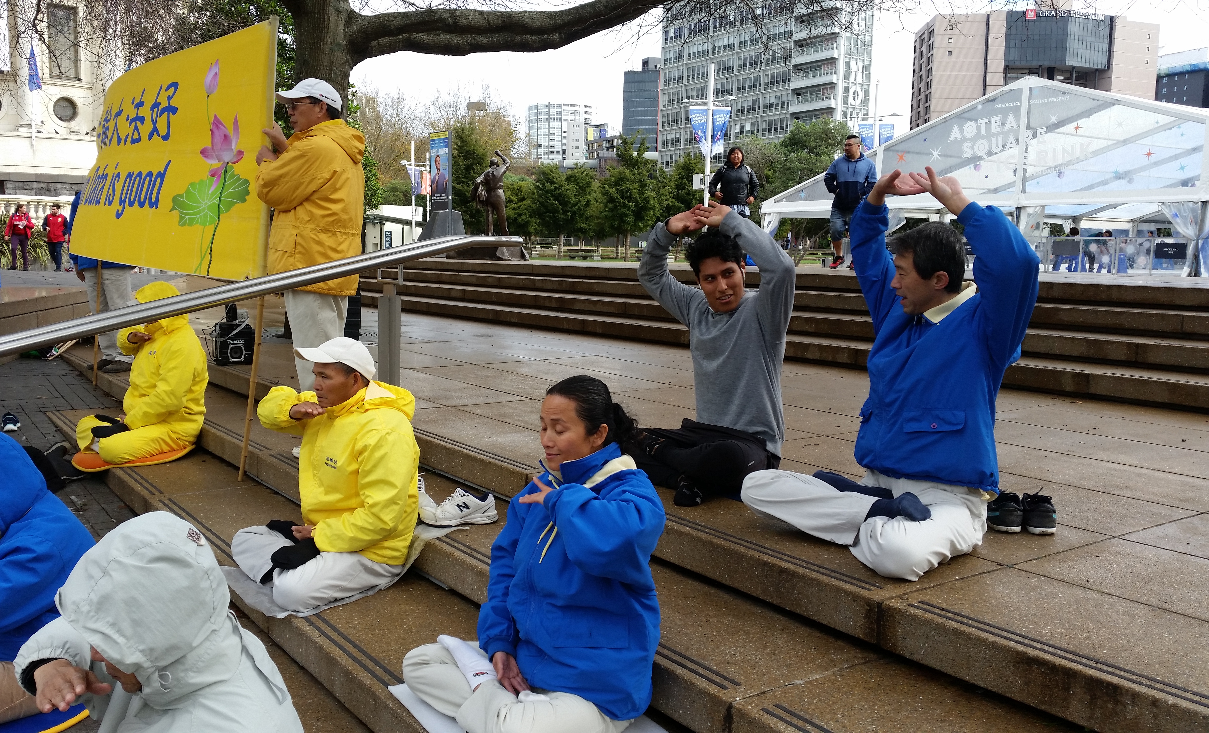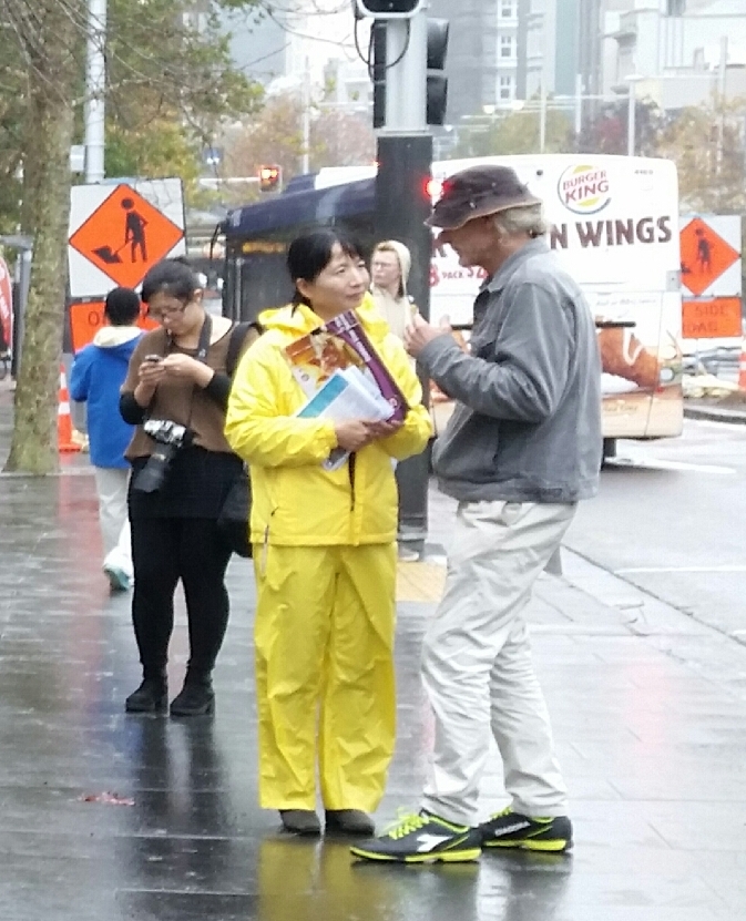【明慧网二零一七年七月四日】位于南半球的新西兰现在正是冬季。而奥克兰的冬季总是伴随着很多阴雨天气。天空不时飘着淅淅沥沥的小雨,奥克兰市中心的周末不象平日那样挤满熙攘的人群,在寒风中只见三三俩俩的人们裹紧上衣,行色匆匆。有这样一群人,静静站在市中心Aotea广场的台阶前,蓝色的外套与金黄色的上衣映衬着他们祥和的面容。给寒冷的冬日增添了一丝暖意。
