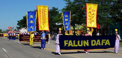 游行开始前,密西根州第13区的州参议员Marty Knollenbery、第41区的州议员Martin Howrylak和Howrylak的助理Ray Watts驻足法轮功学员的花车旁,并与参加游行的部份法轮功们合影。