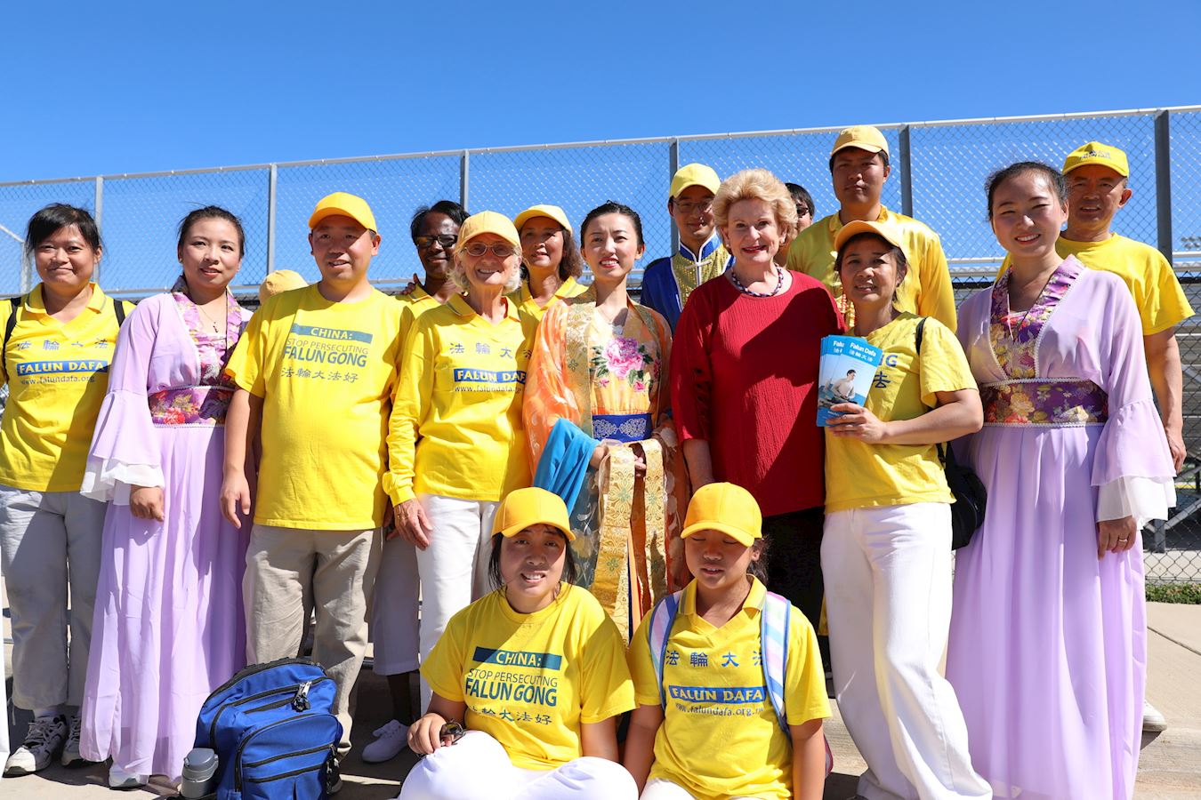 联邦参议员黛比·格里尔·史戴比拿(Debbie Greer Stabenow)来到法轮功学员的花车旁聆听了真相,并欣然和参加游行的部份法轮功学员们合影。她说:“太美了,非常非常的美!”(it is beautiful, very very besutiful!)