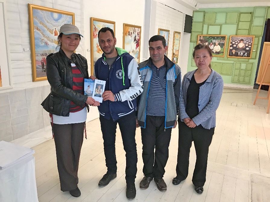 一位来自叙利亚的女士被一幅幅画作深深吸引,她说这是她正要寻找的并且想要了解更多,因为她本人也是一位画家,所以她抱着一颗画家的心来看欣赏画,并且能了解每幅画所要表达的深度。期间听了讲解员的讲解,她被多幅画所打动,最后她在反活摘征签上签名,并表示想要学炼法轮功。