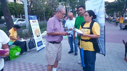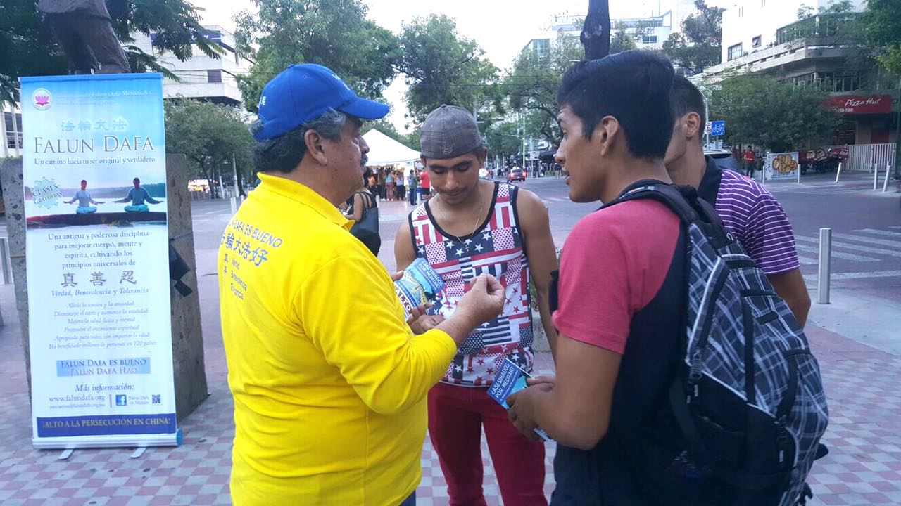 傍晚,学员们一起来到瓜达拉哈拉市的主要文化大道讲真相。一些学员炼功,向路人展示功法。其他学员打横幅、举图片展板,告诉人们中共对法轮功学员的迫害。还有的学员讲真相,征集反迫害签名。路人都非常愿意接受真相资料。当他们了解到中共对法轮功学员的残酷迫害后,非常震惊。