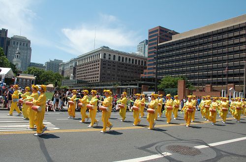 ![]() 图1-2:法轮功学员的腰鼓队在费城独立日游行中。 |