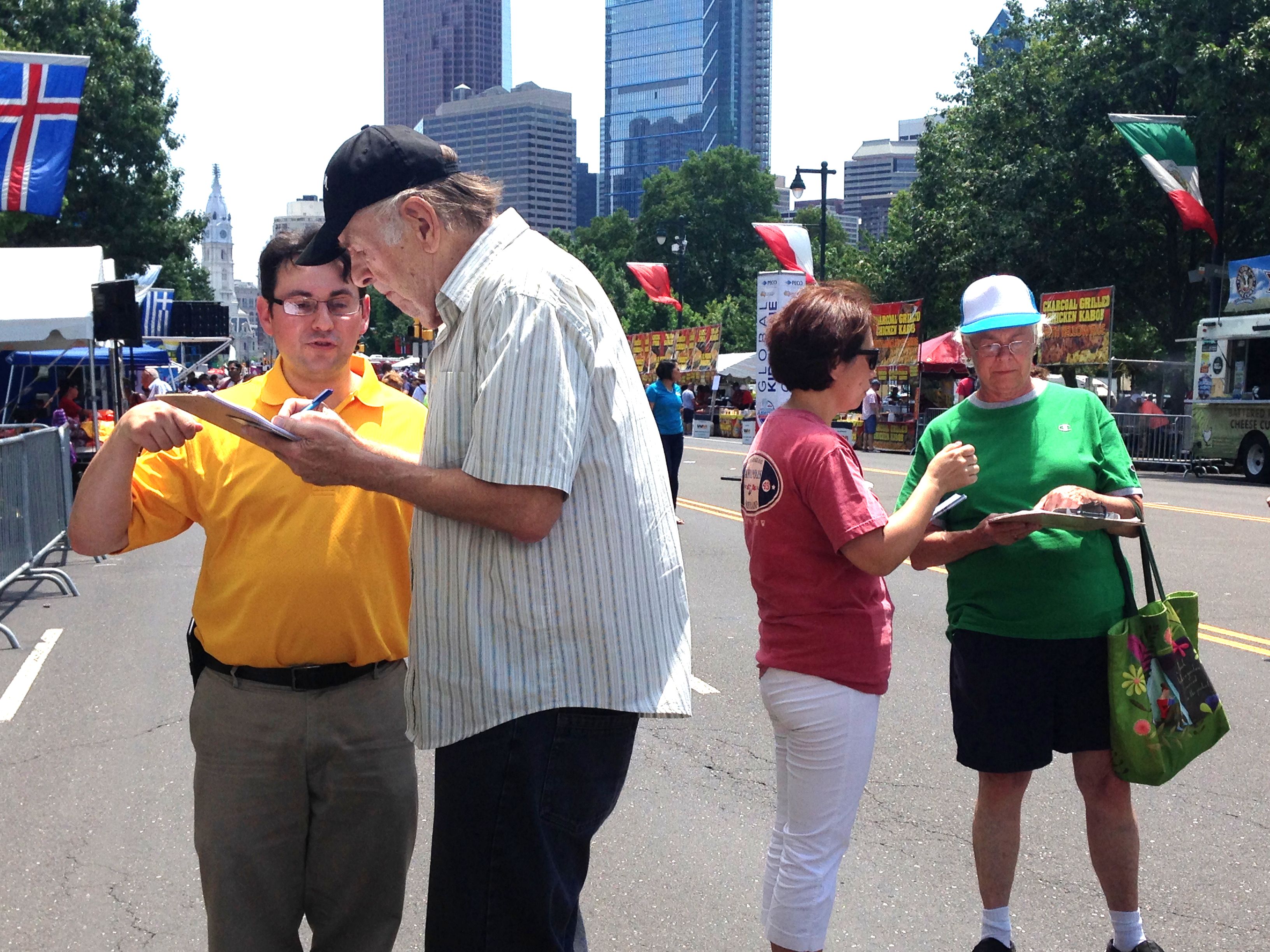 ![]() 图4-5:法轮功学员在费城独立日庆典活动中进行反中共活摘器官的征签,让众多游人了解了真相。 |
