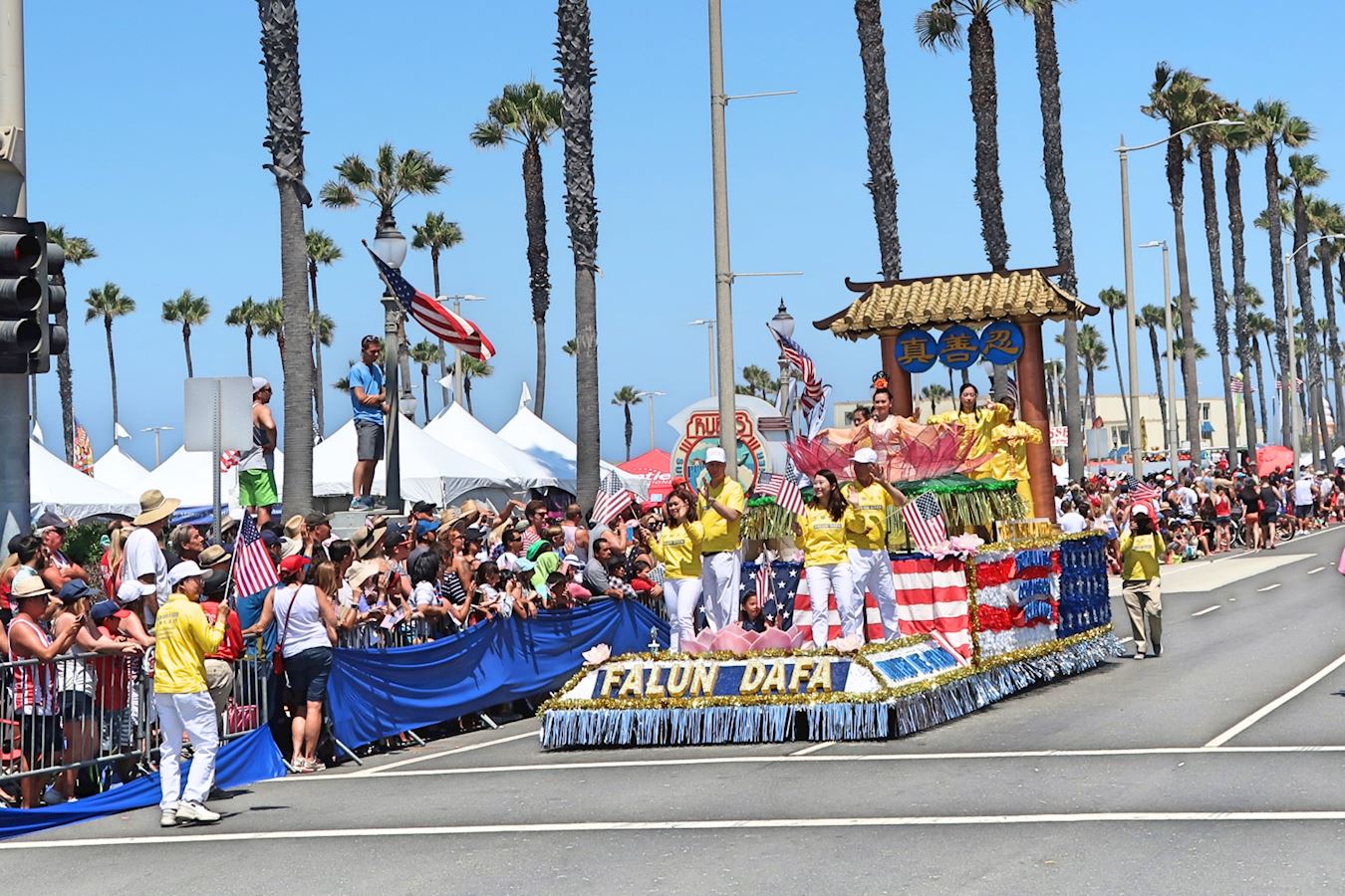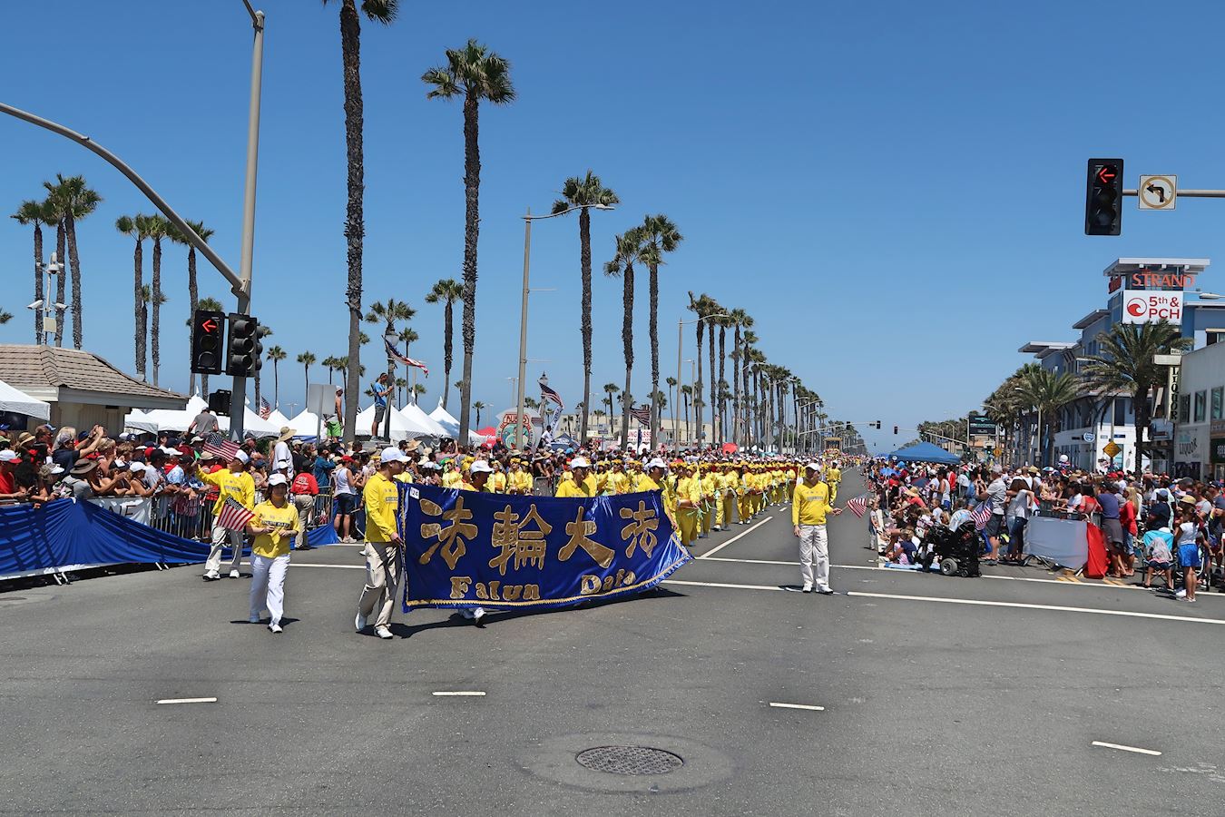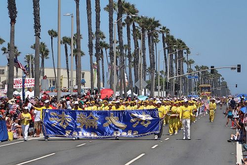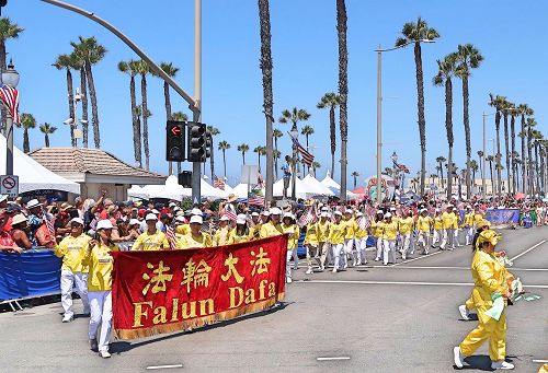 连续参与杭庭顿海滩国庆游行十几年的法轮大法队伍备受观众欢迎,他们身着色彩鲜明的黄色上衣,配着腰鼓队朝气蓬勃的节奏前进,不少人对着他们高呼:“Nice Job!”还有金发碧眼的孩子向游行队用标准的中文说:“你好。”