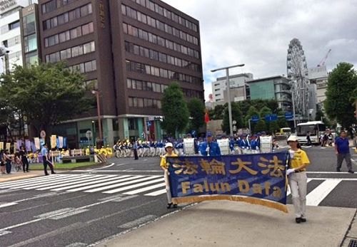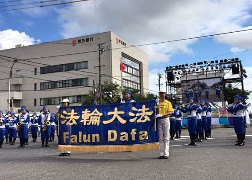 图1~2:八月五日(星期六),法轮功学员们从早上七点开始在爱知县名古屋市中心的荣公园(Sakae Park)炼五套功法,之后在最繁华地区的荣(Sakae)举办游行。游行队伍由精神抖擞的天国乐团引领,其后是打着“法轮大法好”、“真善忍”、“呼吁停止迫害法轮功”等横幅的队伍。