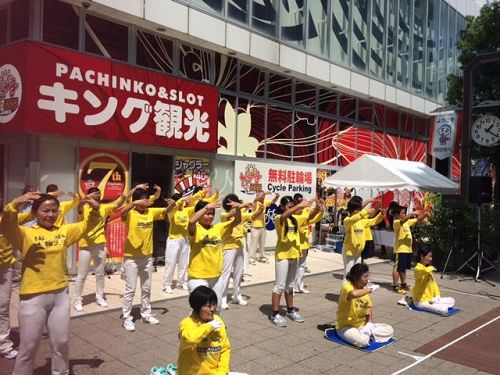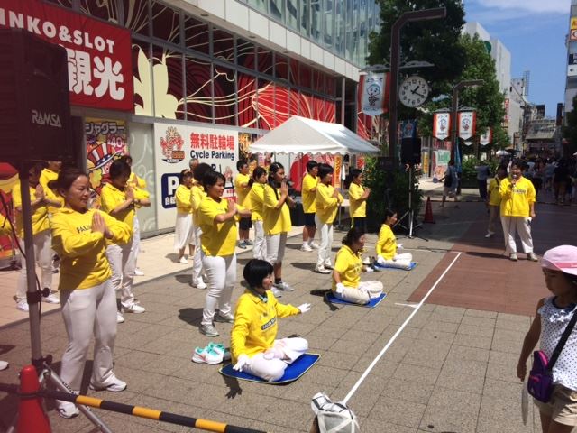 八月六日(星期天)下午,法轮功学员们在四日市市近铁车站附近的“第五十四届大四日市庆祝活动”的广场上,表演了法轮功的五套功法。法轮功学员向观众和行人们介绍:法轮功又叫法轮大法,是由李洪志先生于一九九二年在中国大陆传出的,他教人“真善忍”、做一个好人,而且由于法轮功祛病健身的疗效显著,短短的七年时间在中国大陆就有将近一亿人炼功,现在已弘传世界一百多个国家和地区。