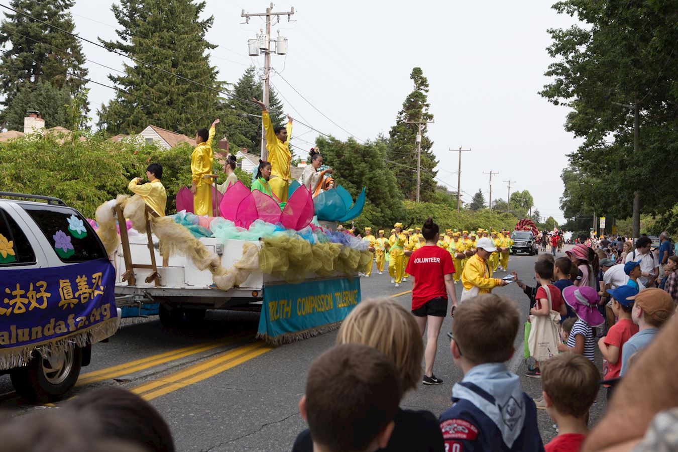 法轮功学员的队伍由“法轮大法”横幅领头,随后是花车,法轮功学员在花车演示祥和、优美的法轮功功法,紧随其后的是令人振奋的腰鼓队。当游行队伍经过时,观众们热情鼓掌,还有的喝彩。许多观众伸手抢着要大法真相资料。一家三口的华人家庭,在法轮功队伍经过时,特地走到队伍前与腰鼓队合影。