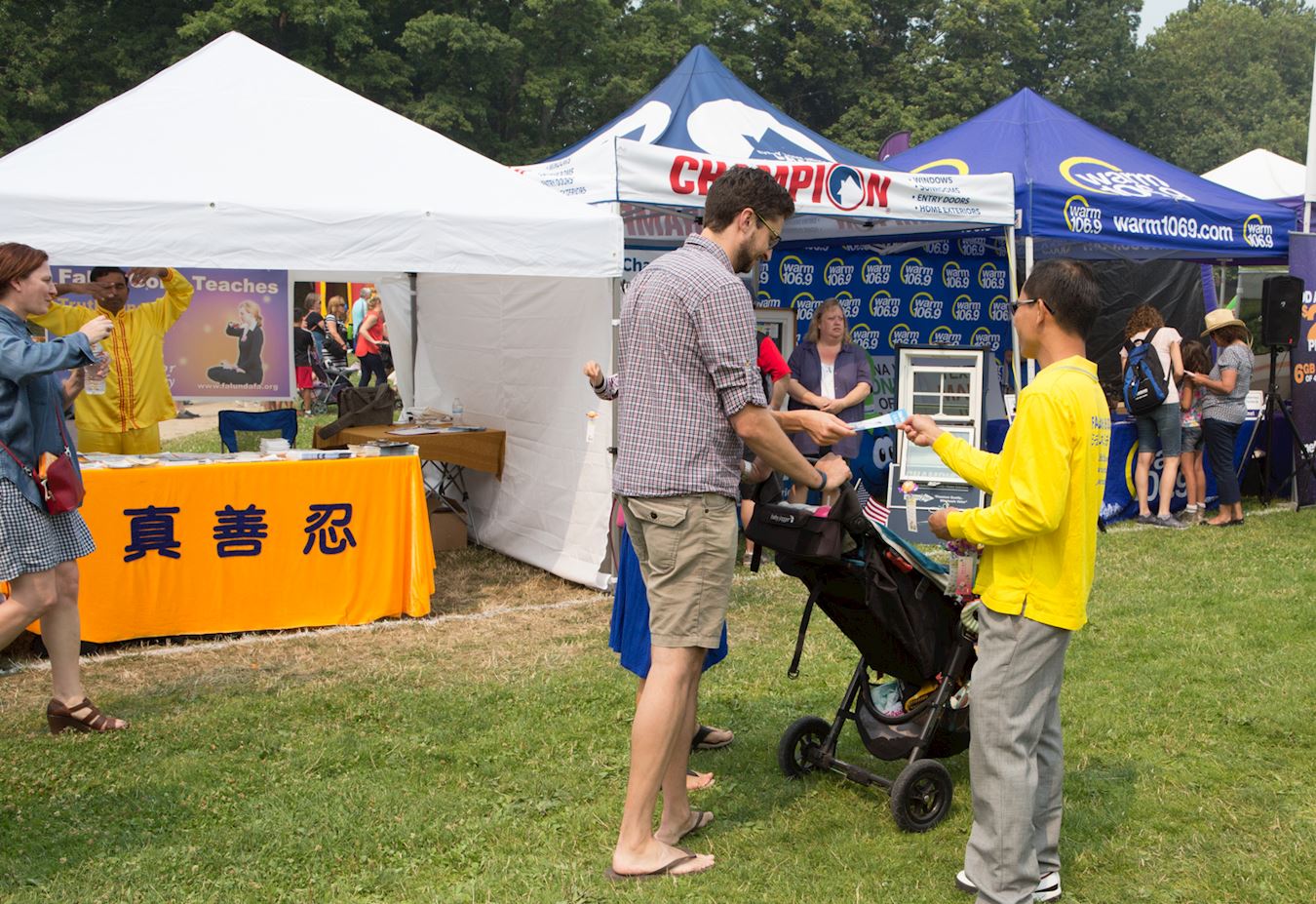 在八月五日和六日的街会中,法轮功学员的真相摊位也受到民众的喜爱,前来询问的家庭一个接一个。其中一对年轻的华人夫妇带着两个孩子经过展位,小女孩看到桌上的纸折的小莲花,特别喜欢,不愿离开,于是学员向她们的父母介绍了法轮功,离开前,他们开心地拿了法轮功的真相资料。一些西方民众听了学员介绍大法后,非常有兴趣深入了解、并咨询哪里可以学习。