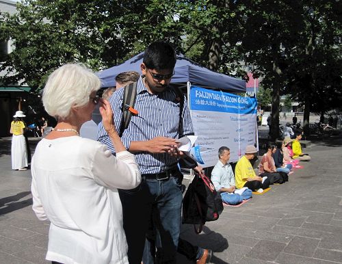 法轮功学员五套功法的演示及祥和的音乐吸引着游客止步观看,有的直接就跟着学炼起来。了解到中共残酷迫害修炼真、善、忍的法轮功学员,人们感到震惊和愤慨,立即签名谴责这种暴行。