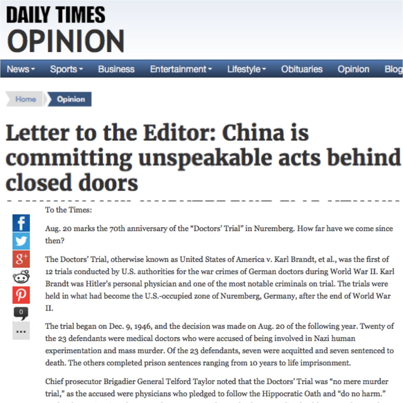今天,建立在希波克拉底誓言下的病人的基本权利没有改变,但是对人类犯罪的认知须改变。了解这种罪行的潜在危险、避免医疗滥用、曝光真相成为唯一的最重要方式。在中国能够发生难以言喻的罪恶不只是因为其强烈的宣传攻势,更是因为这些罪恶是被掩盖的。纽伦堡审判过去了70年,今天,医生必须牢记让真相曝光是避免和停止医疗滥用的最有效方式。
