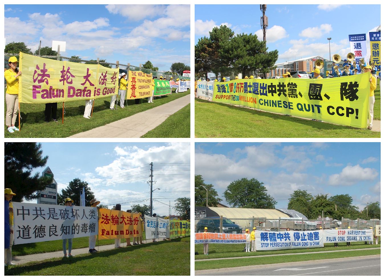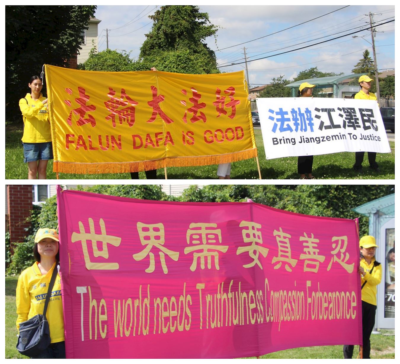 二零一七年八月十二日上午,多伦多部份法轮功学员在这繁忙的太古广场前的十字路口再次筑起了真相长城,天国乐团也到现场演奏,声援二亿八千万人退出中共,学员给民众讲法轮功真相,让更多了解真相的人作出“三:退.”(退出中共党、团、队)的选择。在每分钟过往超过七十辆车的繁忙十字路口,天国乐团的演奏和醒目的横幅吸引了车里的乘客和路人,有鸣笛和竖起大拇指表示支持的;有华人做现场三:退.的,有西人拍照表示支持的。