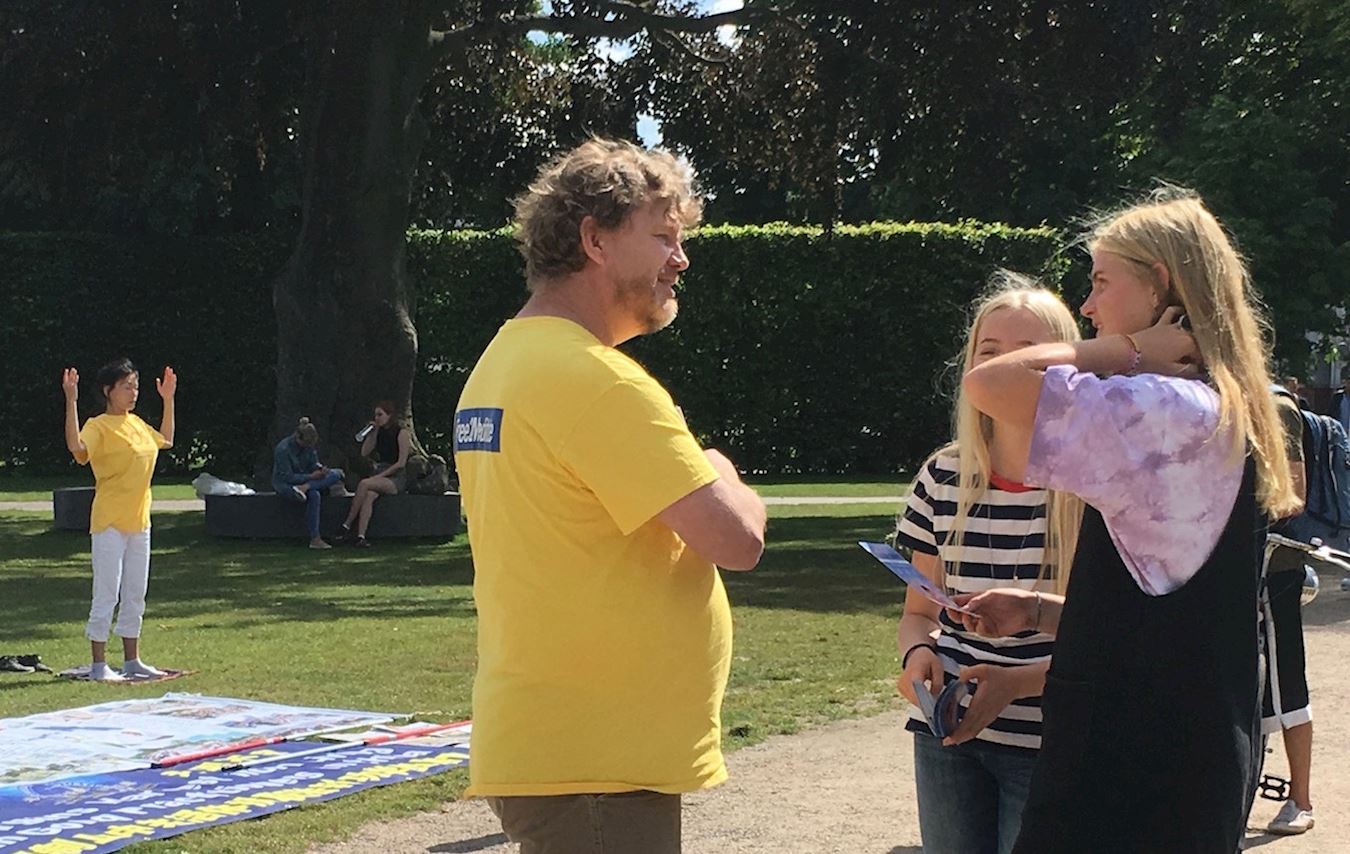 第二天,学员来到了小城市Vejle的商业中心举行活动,介绍法轮功。小镇的居民善良朴实。不少人第一次听到法轮功,当他们了解到法轮功学员在中国无辜遭受迫害,甚至被活摘器官的情况后,纷纷签名支持法轮功学员反迫害。