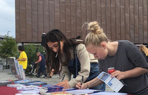 有两位女孩看了图片上的资料后,主动问学员:“我们能够做什么来帮助你们?”学员告诉他们,你们可以签名支持我们,还可以告诉更多的人,使他们知道在中国发生的这场对法轮功学员的残酷迫害。