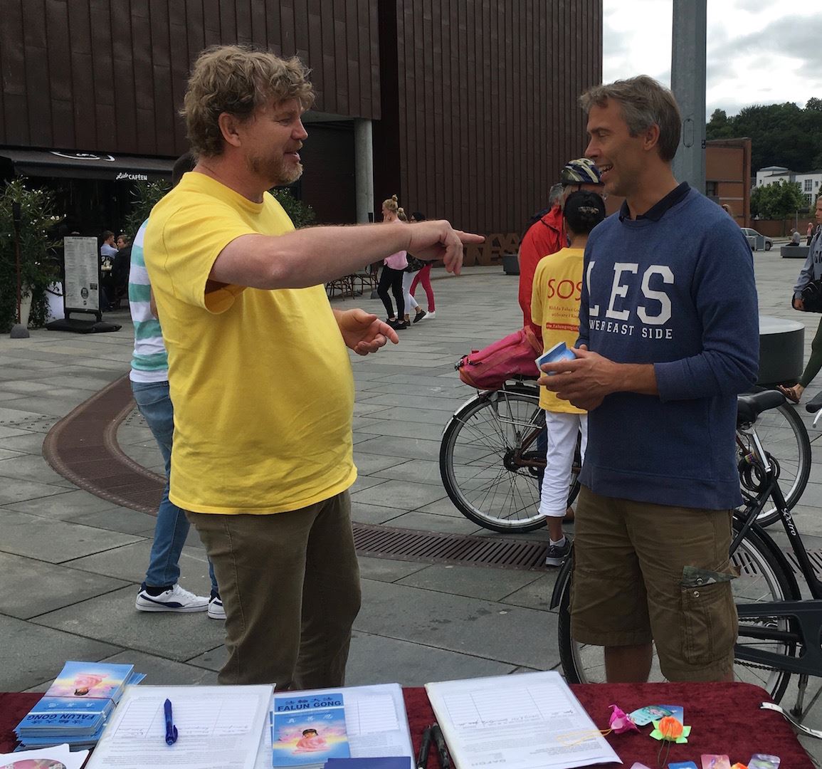一位曾经去过中国的男士骑车路过活动现场,当即下车向学员了解情况。他在中国住了一年,他的太太曾经在中国工作。他们知道中国的人权状况不好,网络封锁,人们不能看到真实的信息,不敢说真话。他说:“我看过一些有关法轮功的资料,也读过法轮功的一些书籍,知道法轮功很好。但是中共为什么要迫害象法轮功这么好的群体?”