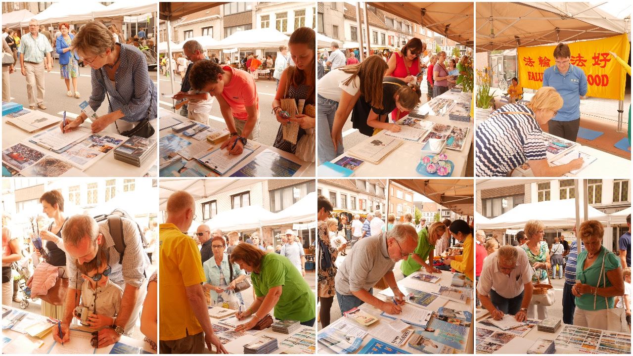 Ann De Roose女士对修炼很感兴趣,和学员讲了她对提高自我的认识。她对法轮功修心养性的特点印象非常深刻,对功法也很感兴趣,她说,儿子有个女朋友是台湾人,女孩告诉她,公园里有很多人炼一种动作舒缓的功法,但并没有说是什么功法。今天看到学员展示法轮功功法,Ann认为她儿子女朋友描述的应该是法轮功。同时她也了解了法轮功在中国无辜被迫害的真相,她在反对迫害的征签簿上签名。Ann最后拿了几份关于迫害真相的传单及中文小册子,离开时她说她儿子可以翻译,并讲给他女朋友。
