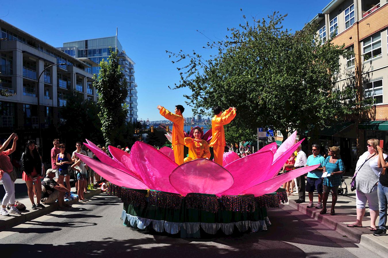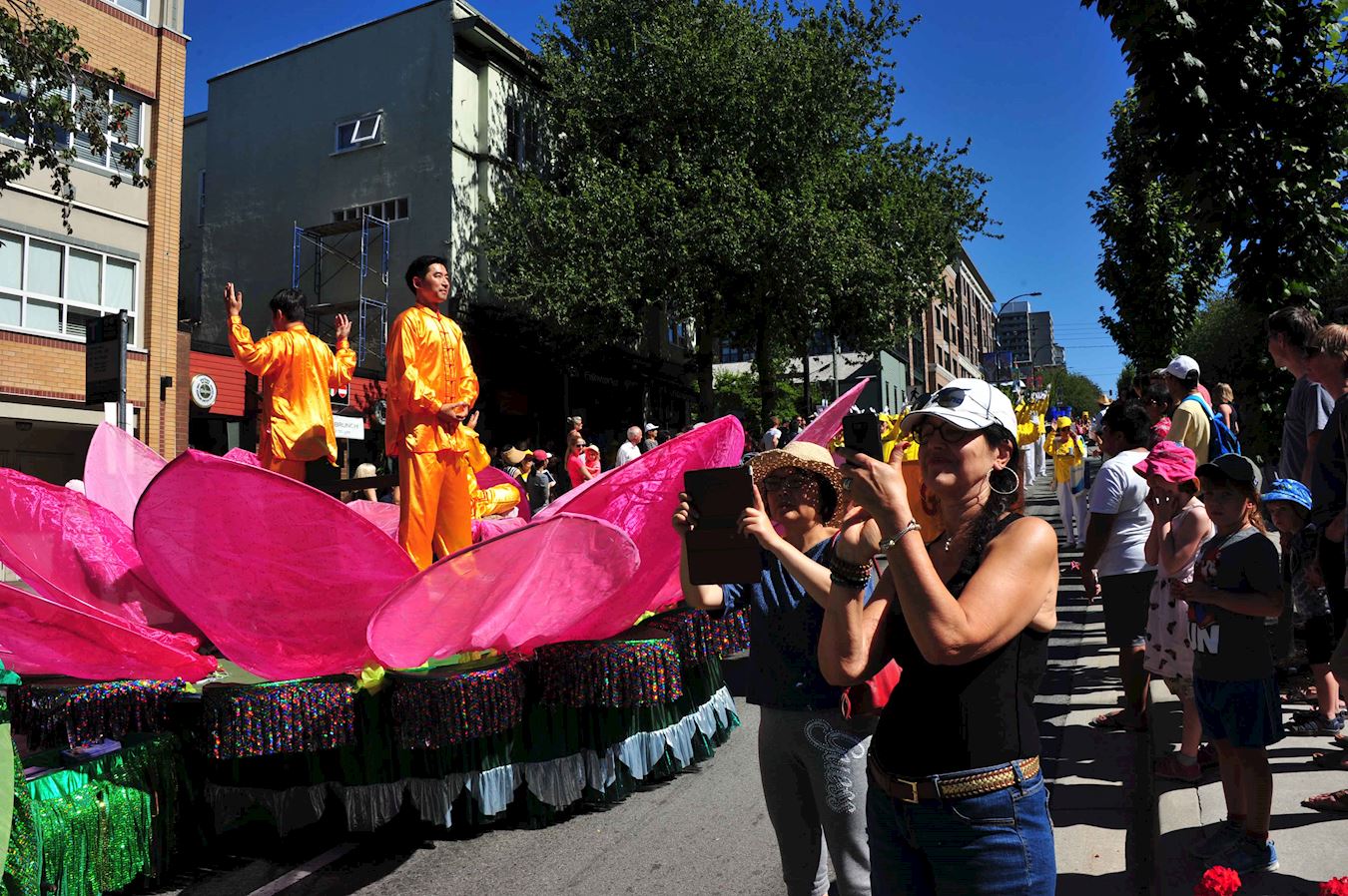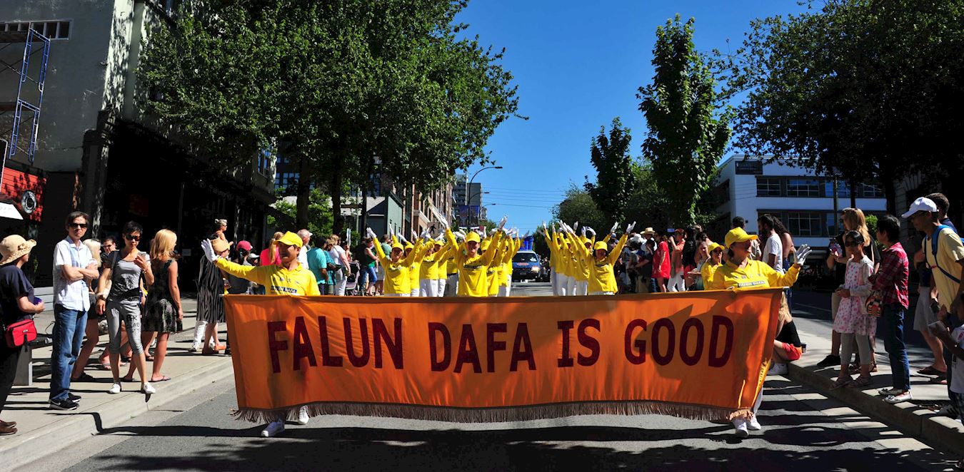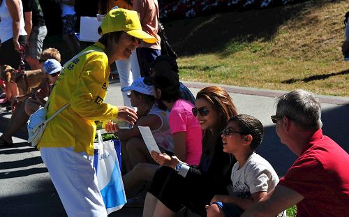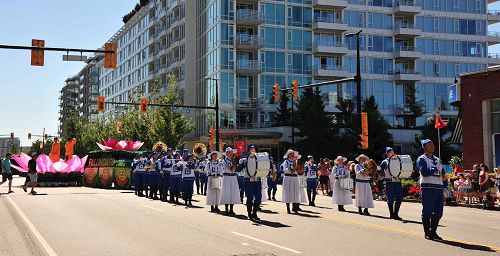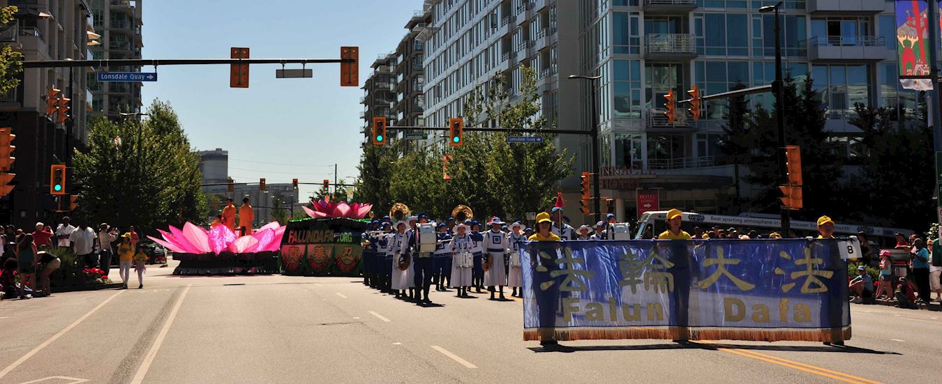 北温哥华市是个景色秀丽的小城也是大温哥华地区的著名旅游景点之一。法轮功学员的游行队伍包括天国乐团、“真善忍”花车和法轮功功法演示队。法轮功学员的游行队伍一路走来受到沿途观众的热烈欢迎,很多观众纷纷与法轮功学员的游行队伍合影留念,还有民众为法轮功祥和的功法演示所吸引在路边现场模仿法轮功功法的动作,大批观众应和着天国乐团的音乐为法轮功学员的游行队伍鼓掌欢呼或表示“Falun Dafa is good”。人们在路边现场阅读,传阅和讨论法轮功的真相资料内容。有华人看到法轮功学员的游行队伍后兴奋地说,看法轮功来了!还有华人与法轮功学员的游行队伍一路相随拍摄法轮功学员的游行场面,一位大陆华人女士拿了法轮功真相资料后,说法轮功花车的莲花座真漂亮,并特意与法轮功学员的游行队伍的花车合影。