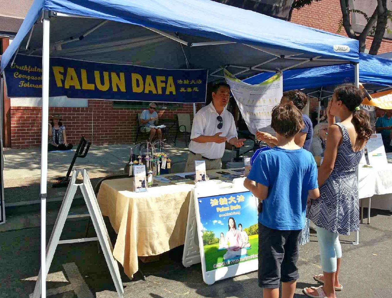 家在附近居住的朱莉萨(Julissa)带着两个可爱的女儿来参加番茄节,看到法轮功展位很高兴。原来她在家从网上已学炼了一段时间,一直想找机会跟其他法轮功学员一起炼功,帮助纠正动作。她高兴地和学员交谈,并留下了联络信息。可刚离开一会儿,她又回到展位来,希望学员现场教她,一旁的小女儿也兴趣浓浓地认真地从头学到完,还告诉学员们她美丽的中文名字。