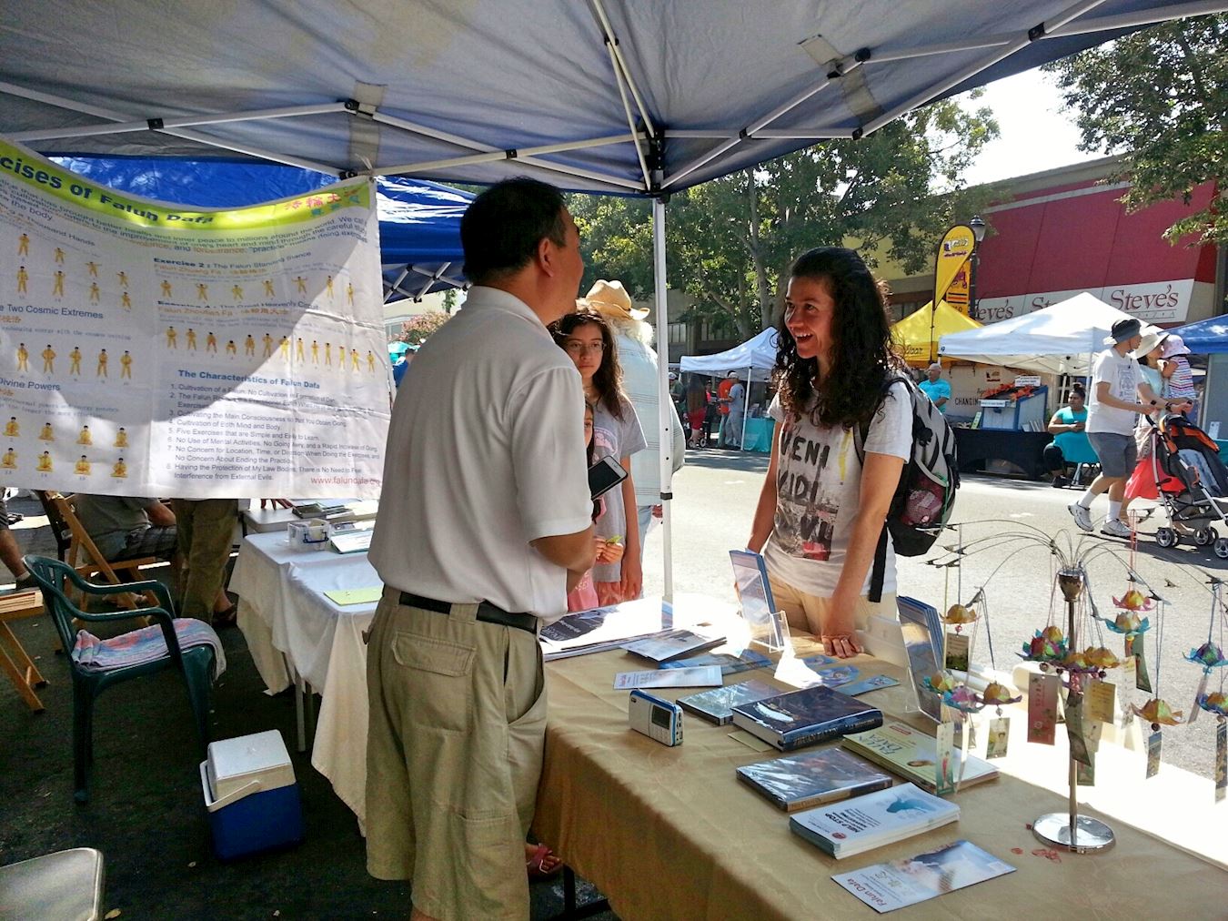 当天不少游人见到法轮功学员如同见到老朋友一般,亲切开心地与学员打招呼。有一位正在追赶朋友的女士一见到法轮大法展位,惊喜地“啊”的一声,似乎没想到能在此邂逅法轮功学员,于是快步走到展位拿了真相资料,然后高兴离去。许多人径直走到展位问哪里可以学炼功法?当了解到学炼大法非常简单方便,只要上网就可以免费下载包括书籍,法轮功九天讲法和教功的音像带等一切资料,自己在家就可学炼时,都非常高兴和满意。