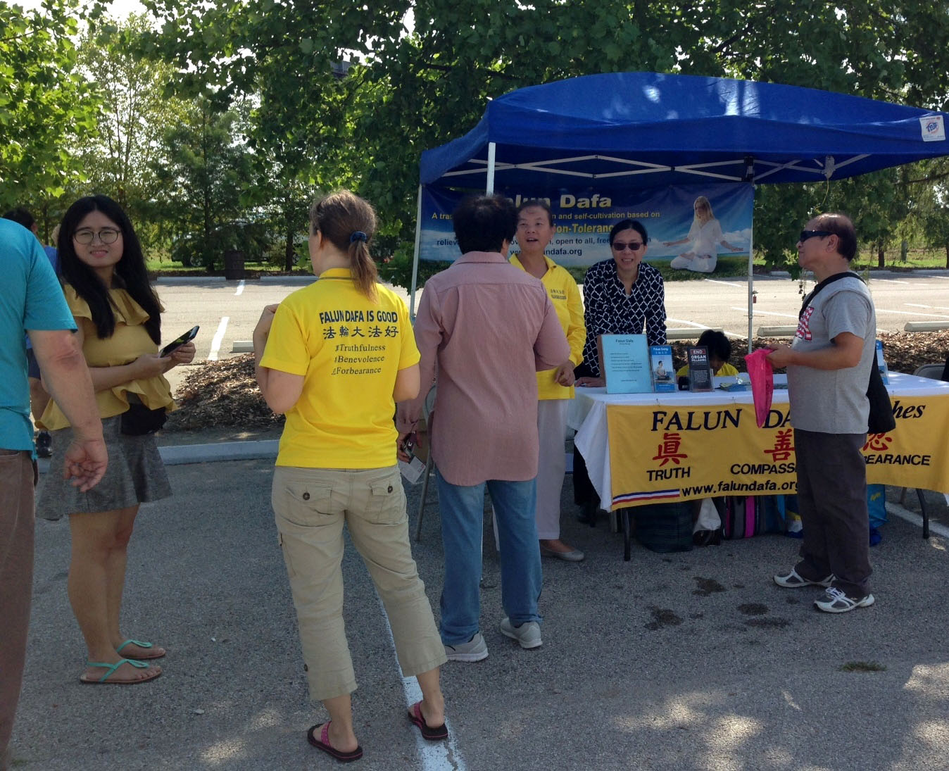 一家从中国刚来探亲的家庭也在展位前和学员交谈。他们表示知道法轮功在中国遭受的迫害,并对法轮功学员表示同情。