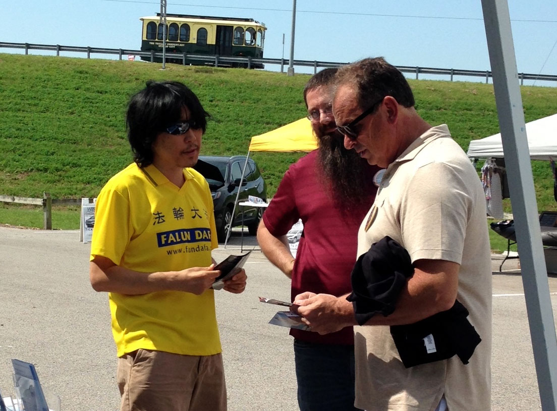从早上十点开始,就陆续有观众经过法轮功学员的展位。这些观众有的来自俄克拉何马州,爱荷华州,德克萨斯州,科罗拉多州,南达科他州,还有来自中国探亲、正好赶上看日食的游客也在展位前和学员交谈。