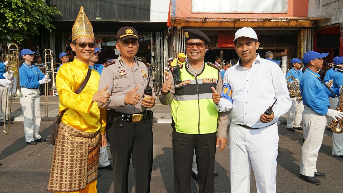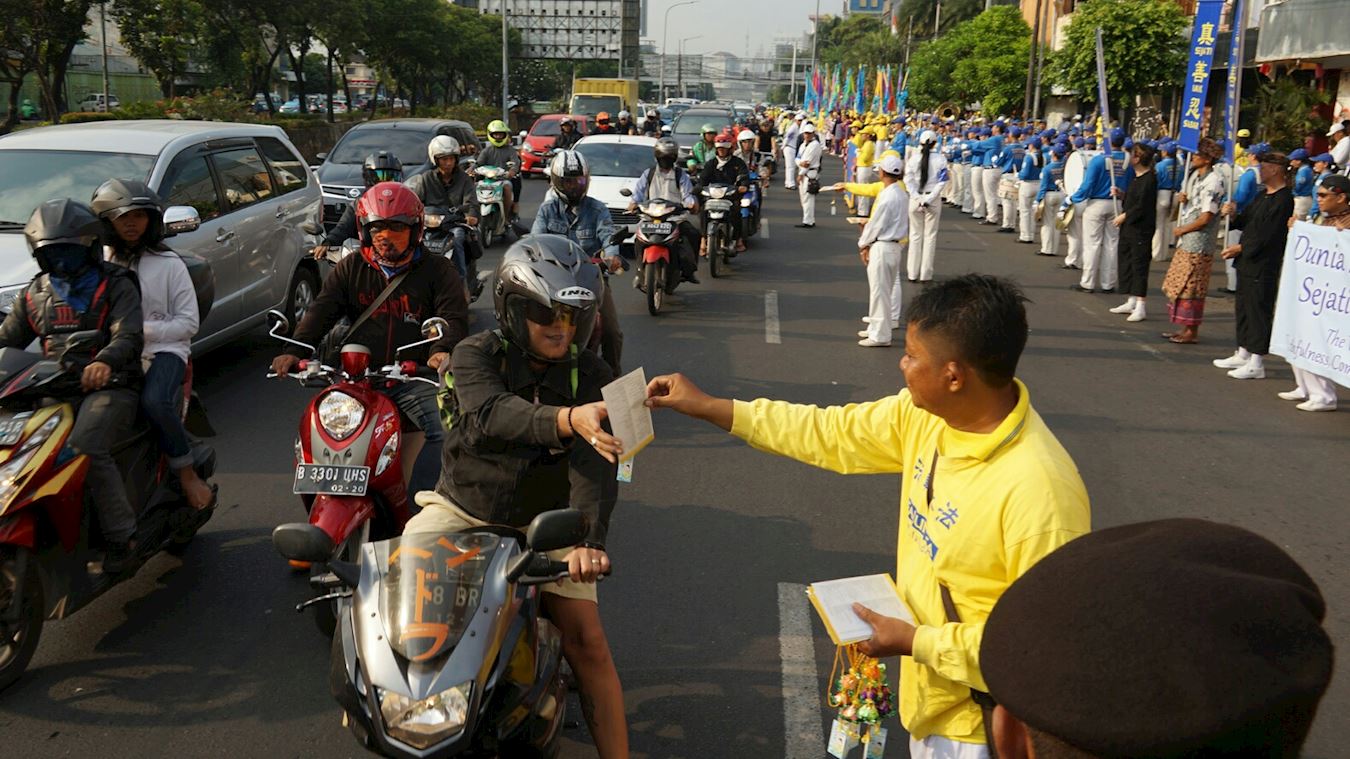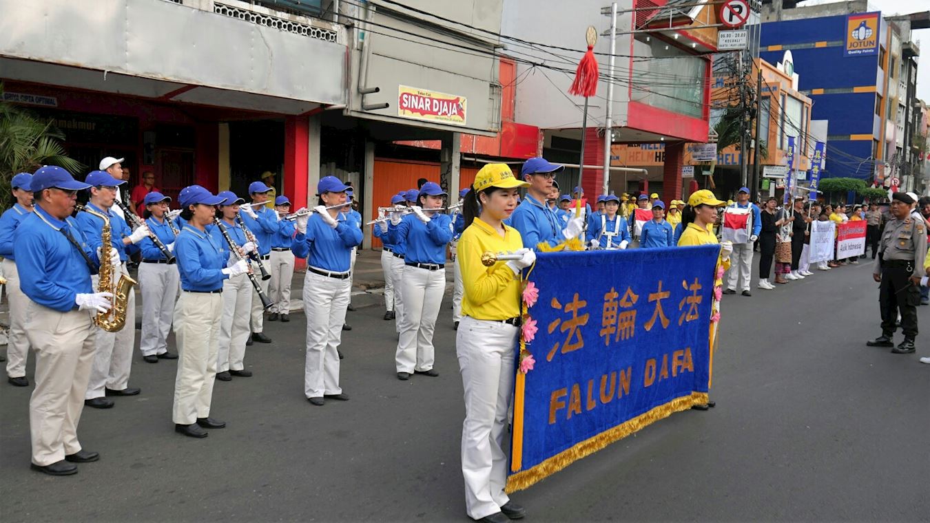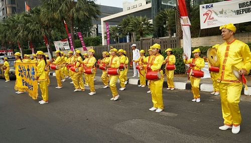 八月十九日早上,由法轮功学员组成的游行队伍,在雅加达华人聚集地区的街道上,把法轮大法的福音带给广大民众。游行队伍中有天国乐团、腰鼓队、旗幡、绚丽多彩的横幅,传递着“真善忍”、“法轮大法好”、“世界需要真善忍”、“停止迫害法轮功”等正义之声。