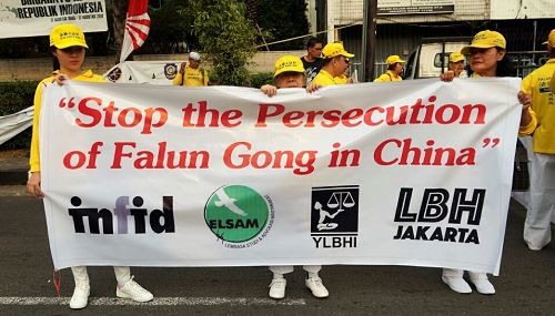图1:法轮功学员在雅加达中使馆前和平抗议中共迫害 |