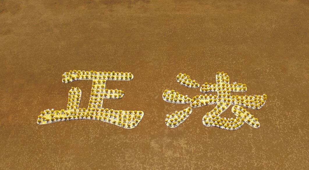 游行之后,法轮功学员们聚集在大广场,排出“正法”两个大字。场面十分震撼。