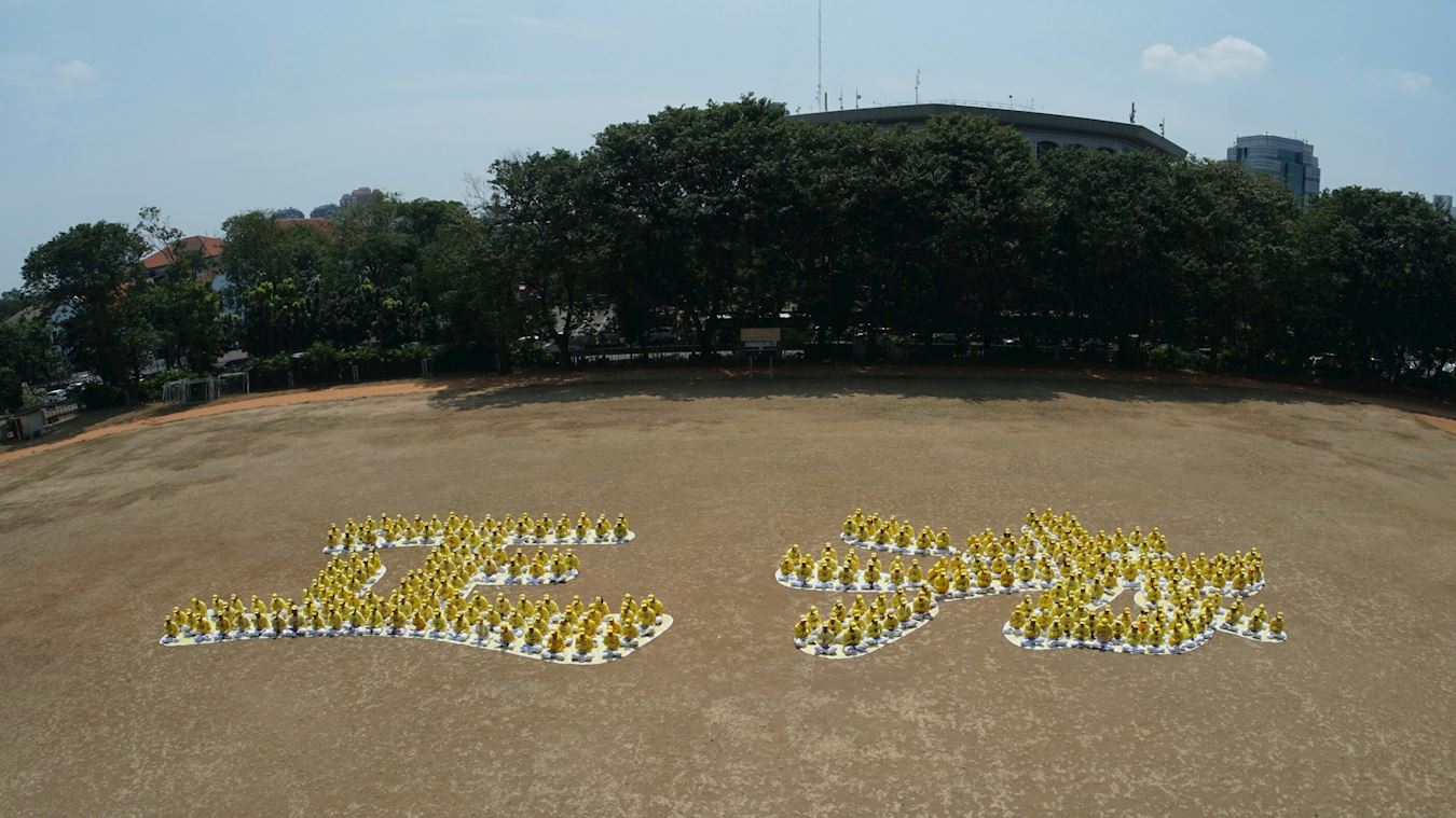 图9~10:印度尼西亚法轮功学员们排出“正法”两个大字 |
