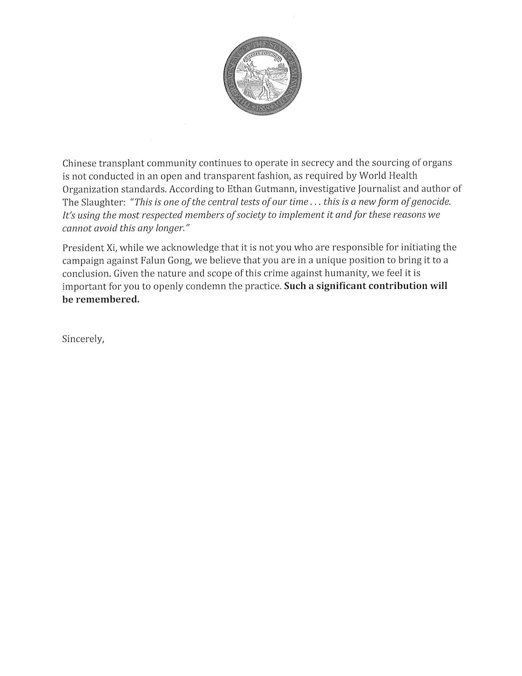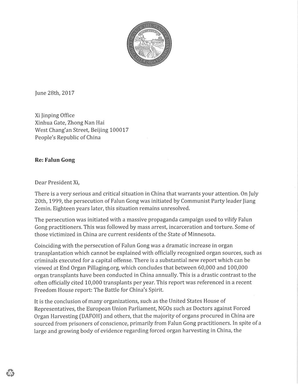 二零一六年,明州参议院通过了一项决议(议案号SF2090),“关注发生在中国的、系统性的、政权认可的、从良心犯身上强行活摘器官的行为,这些良心犯主要包括因信仰被关押的法轮功学员、及其它宗教和少数族裔人士。”虽然中共驻芝加哥领馆极力阻挠,该议案还是得到两党的一致支持,并在表决中以全票通过。