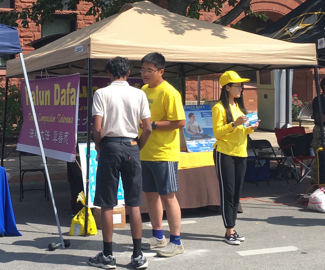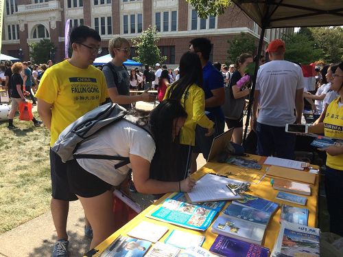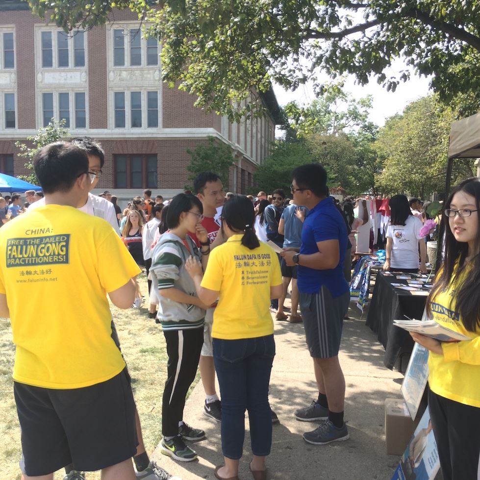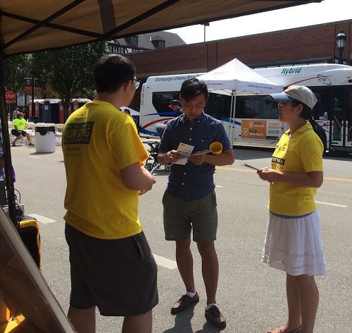 八月二十五、二十六两日,厄巴纳市(Urbana)中心热闹非凡,从二十五日下午开始,许多当地居民和来自周边城市的游客,纷纷涌向厄巴纳市中心街区,品尝甜玉米,浏览街边兜售各种手工制品和食物的摊位。当地法轮功学员也在这里摆放了一个讲真相的展位,向游人介绍法轮大法以及中共迫害法轮功的真相。这个周末也是伊利诺伊大学厄巴纳-香槟旗舰校区(University of Illinois at Urbana-Champaign)学生开学前的最后一个周末。许多中国留学生利用开学的空闲,来参加玉米节活动。在这个自由的国度,许多中国学生都惊讶的看到法轮大法在国外以正面的形式出现在他们眼前。一部份学生看到法轮大法的字样和穿着黄色衣服的青年法轮功学员后开始兴奋地和同学谈论着,或远远的观望着,或主动上前来了解真相。还有一部份在忐忑的接了传单后兴奋地和自己的同学翻看着这国内看不到的真相。