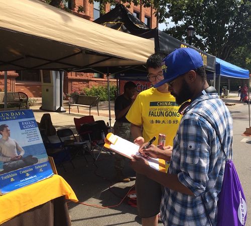 一位有着亚裔血统的娇小的女子来到法轮功学员的摊位上,了解到法轮功学员在中国大陆被中共活摘器官的真相后,表现的非常震惊。她说任何一位有良知的生命都应该站出来抵制这种罪恶;她在反活摘的签名表上签了名后,离开了。不一会儿,她把她的西人丈夫带来到展位,她手指着反活摘的签名表让她的丈夫签名,当她的丈夫认真读完表上的内容后,也郑重签下了自己的姓名。
