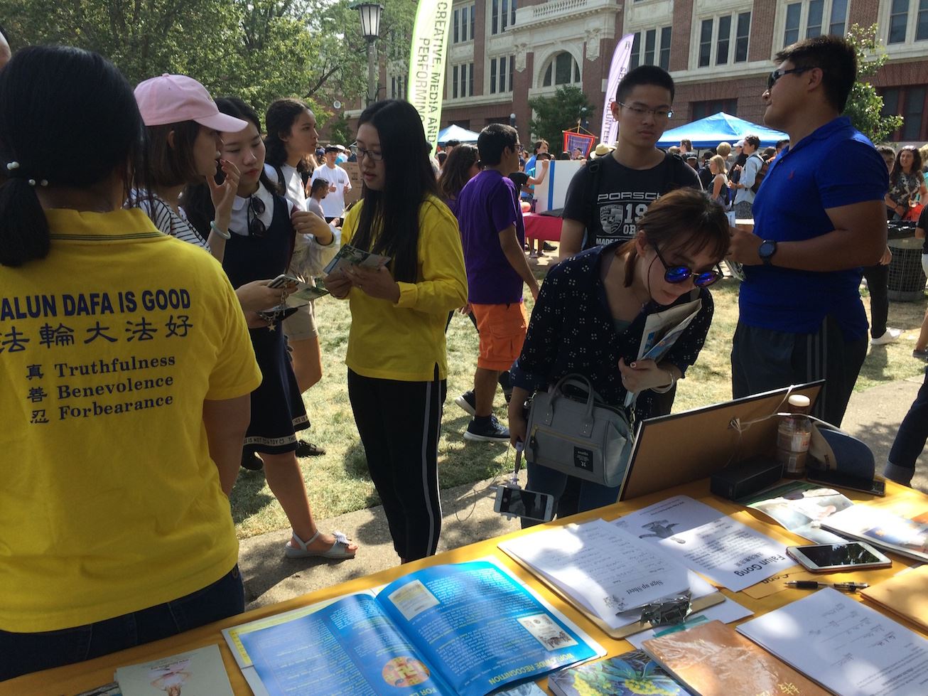 四名从中国来的新生在玉米节闲逛时惊喜地发现了法轮大法的展位,然后在远处观望并讨论了一会儿后走向了学员表示想了解真相。经过学员耐心地讲解以及轻松愉快的交谈,他们都明白了大法真相并且由衷地感叹道:“我就是觉得你们(青年学员)看起来很正常啊!所以想来了解一下,才发现原来是这样!”