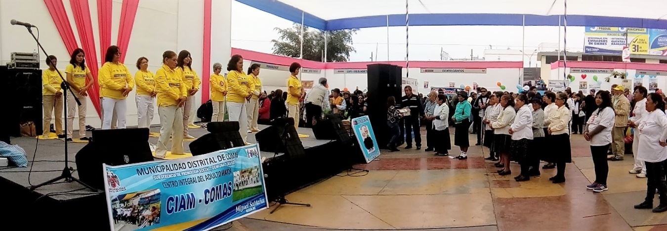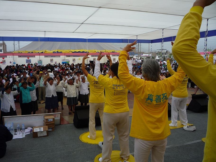 ![]() 图1:秘鲁法轮功学员应国家卫生部的正式邀请,在果玛斯的老人服务日社区活动上介绍功法 |