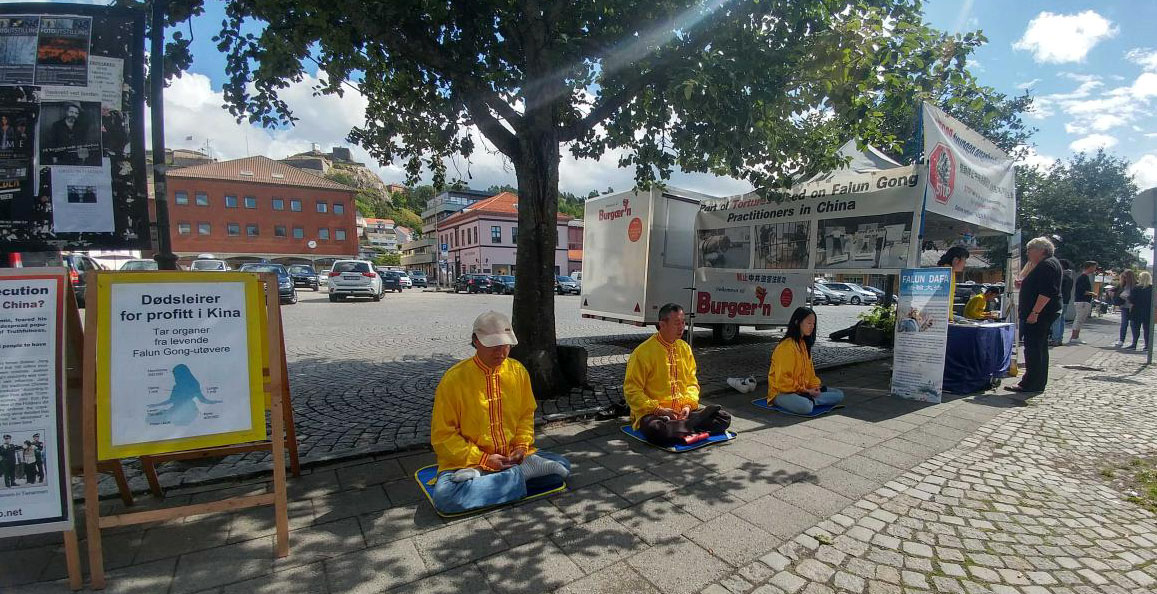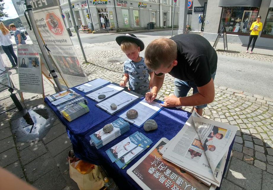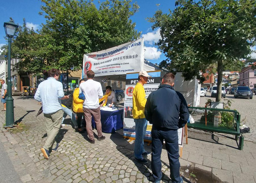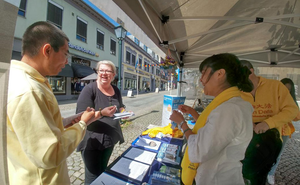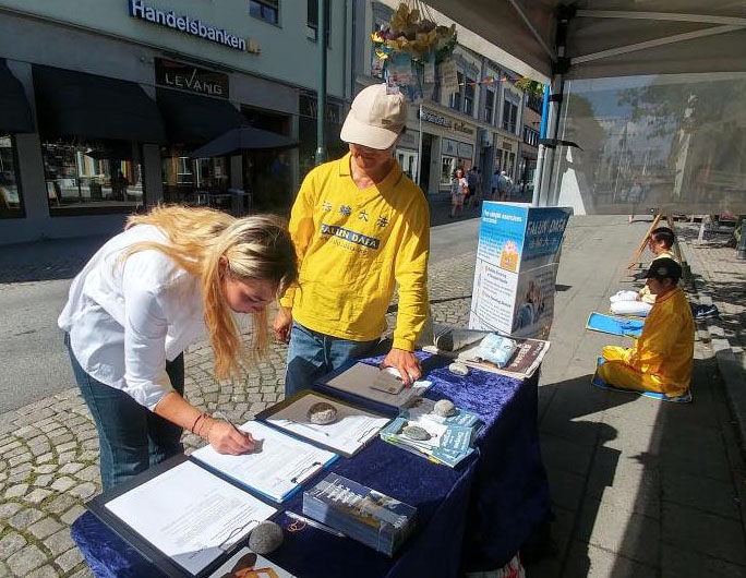 【明慧网二零一七年八月四日】哈尔登(Halden)位于挪威东南部,靠近瑞典边界,濒临滨斯卡格拉克海峡,是挪威一座著名的边境要塞城市。每年六至八月份是北欧民众休闲度假的季节。每隔半个月的周三,在哈尔登会举行大型的电视秀活动——“大家唱”,届时来自挪威、瑞典的艺术家、歌手们会登台献唱,很多挪威和瑞典的民众会慕名而来。二零一七年八月二日周三,借“大家唱”电视秀活动再一次举行之际,来自挪威首都奥斯陆的多名法轮功学员驱车来到哈尔登。他们在这里摆设法轮功真相展位,把法轮大法的美好带到这个山清水秀、安宁静谧的城市里。