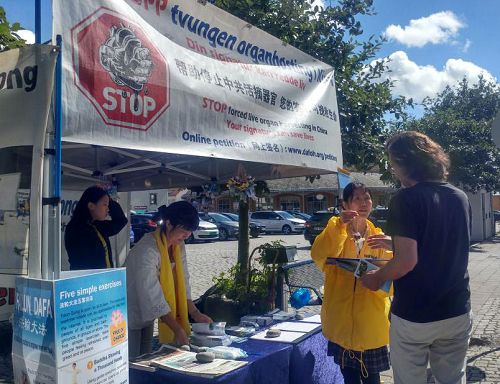 一位名叫阿曼达(Amanda)的女士已经练了十多年的打坐,她告诉法轮功学员,她之前就了解到迫害和活摘真相,这次看到法轮功的游行队伍,非常高兴,她并要了当地法轮功炼功点的信息,准备到炼功点学法轮功。临别时,她告诉学员,她非常荣幸能够遇到法轮功学员。